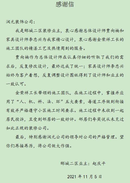 2021年11月5日,AG真人收到了一封来自郦城二区业主赵先生发过来的感谢信。信中表达了业主对设计师贾向楠的设计,以及认真负责的态度的认可。对家具设计师李忠兴从客户角度出发,始终为客户着想的工作态度的赞扬,以及对金荣祥工长施工团队的精湛工艺以及热情周到的服务的感谢。AG真人一直都在做大做强的路上不断努力,感谢业主的信任。