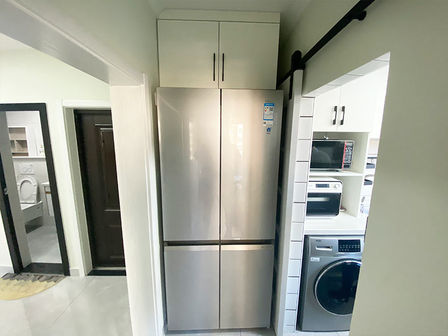 设计师拆除了原厨房外的壁橱,将四开门冰箱放置在了这里,利用爱格板定制家具增加了冰箱上方空间的储物。