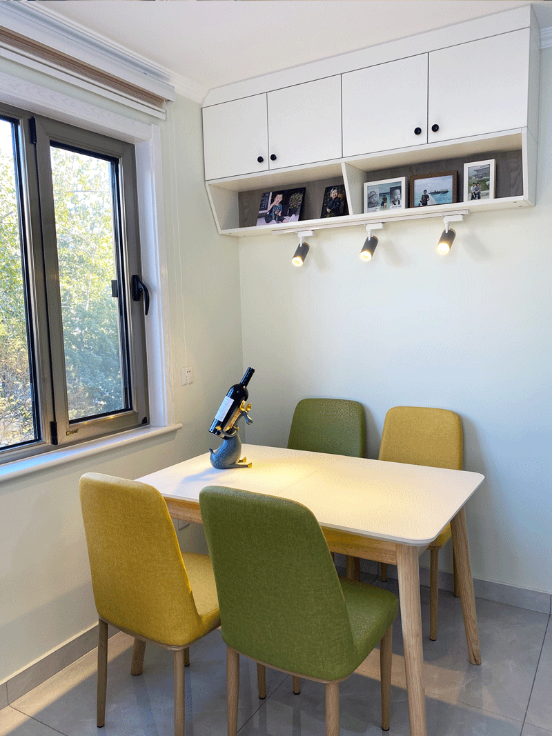 设计师将客餐厅规划到了原来主卧位置,餐厅区域设置一个可以拉伸的600乘以1米4的餐桌,平时是四人位,拉伸后可满足八到十人的位置需求,餐桌后面一组爱格板定制吊柜增加了储物空间。