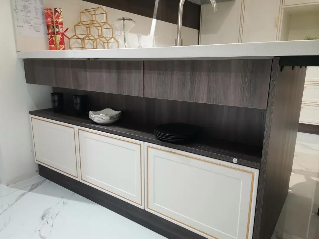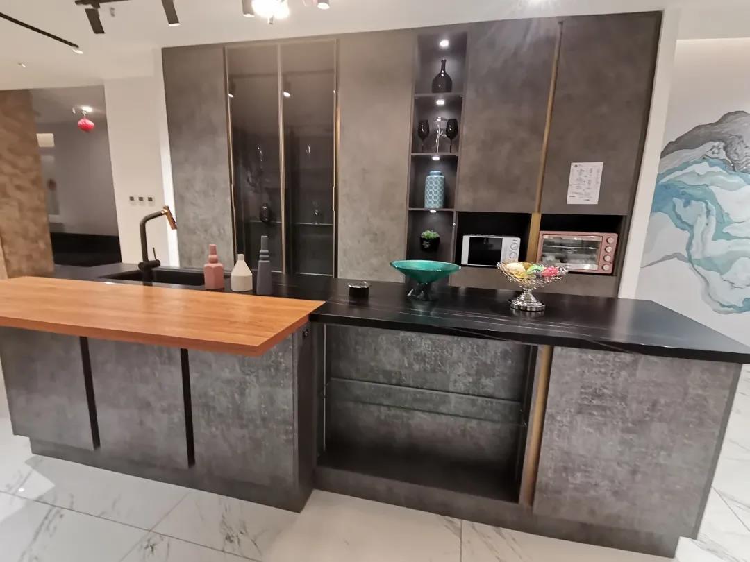 这套厨房适用于100多平米的大户型,一整面墙的柜子既可以作为橱柜又可以当展示柜。中间的岛台,岩板和进口板材的结合为厨房提供了更多的选择。