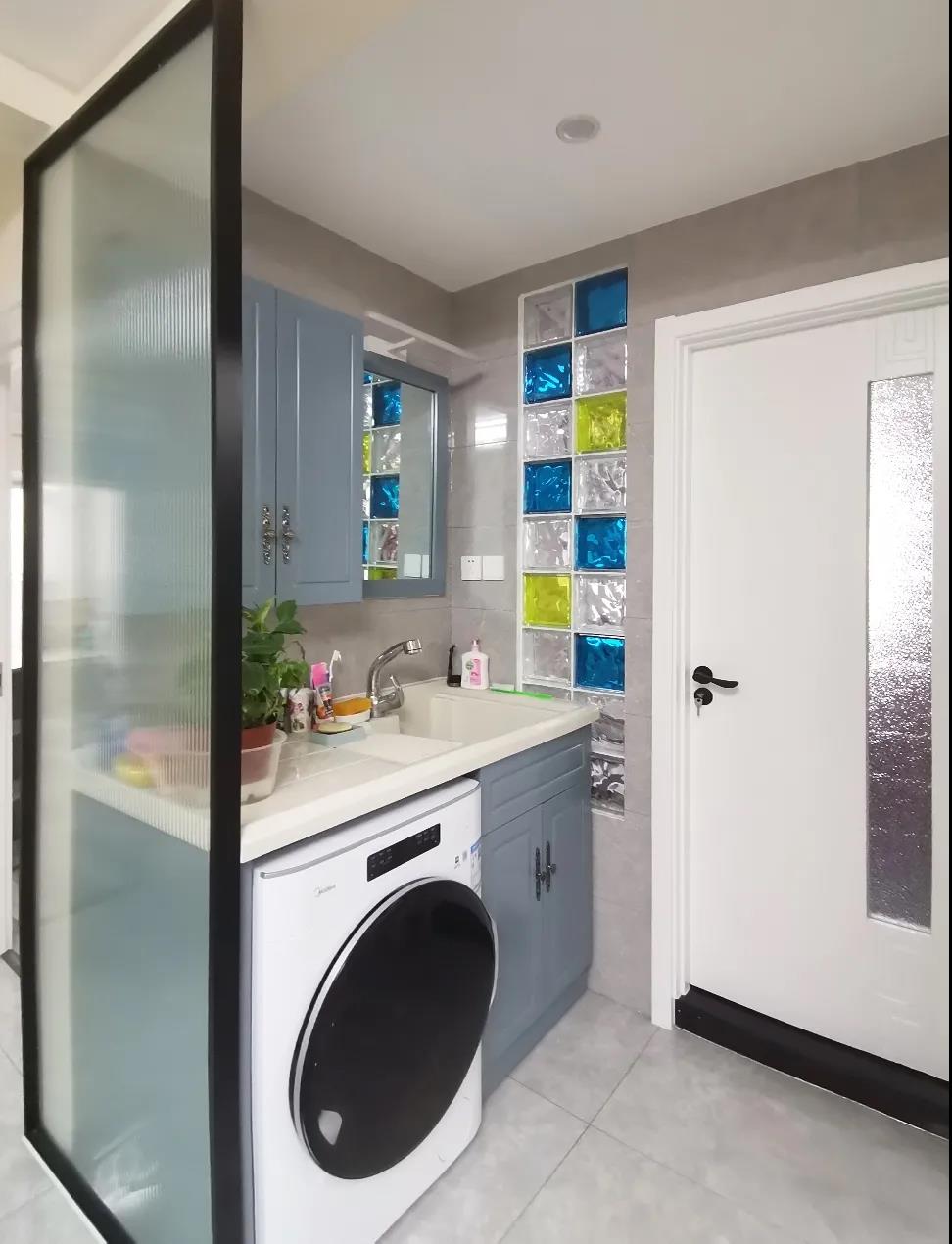 设计师将洗手盆和洗衣机外移,将此处2平米的空间规划为卫生间的干区,利用定制家具打造了一组浴室柜,合理利用空间的同时也增加了储物。