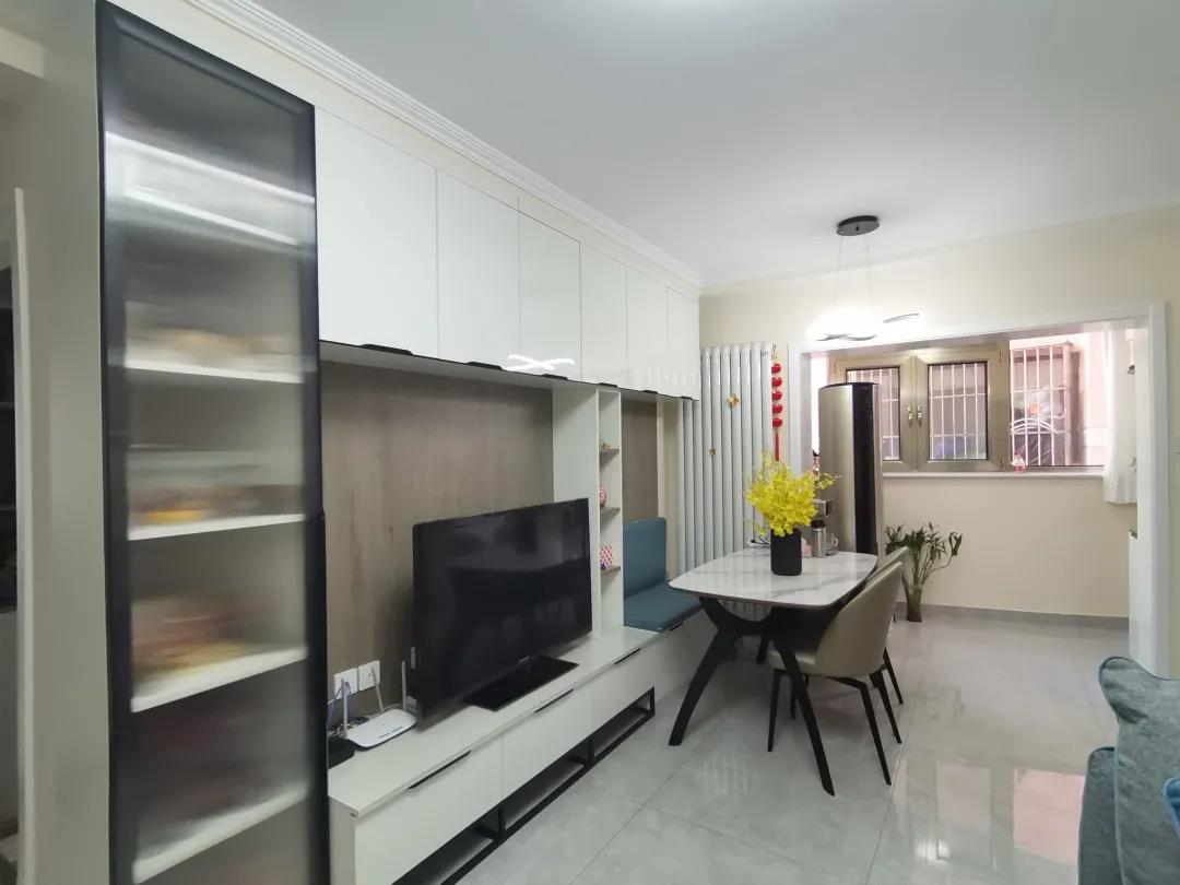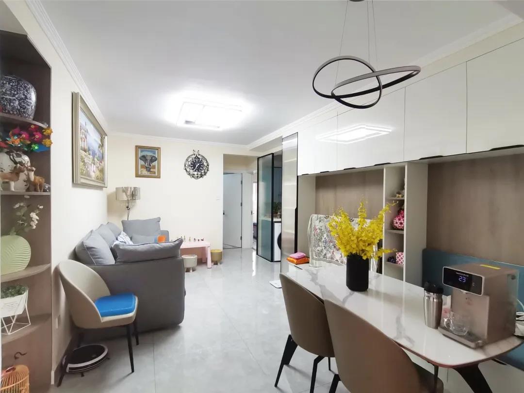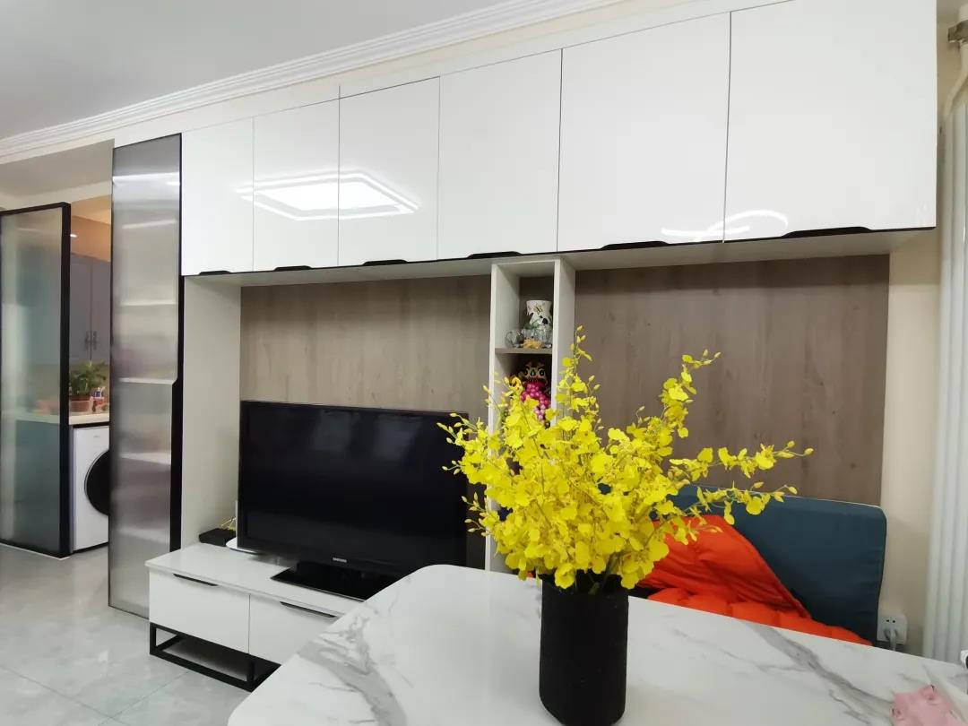 设计师拆掉了不承重的门联窗,将阳台纳入客厅,客厅面积由17平米扩大到了22平米,将此处打造为餐客一体的空间。利用定制家具打造的一体的电视餐边柜,用餐娱乐更方便,保障空间开阔性的同时,最大限度的增加了储物空间。