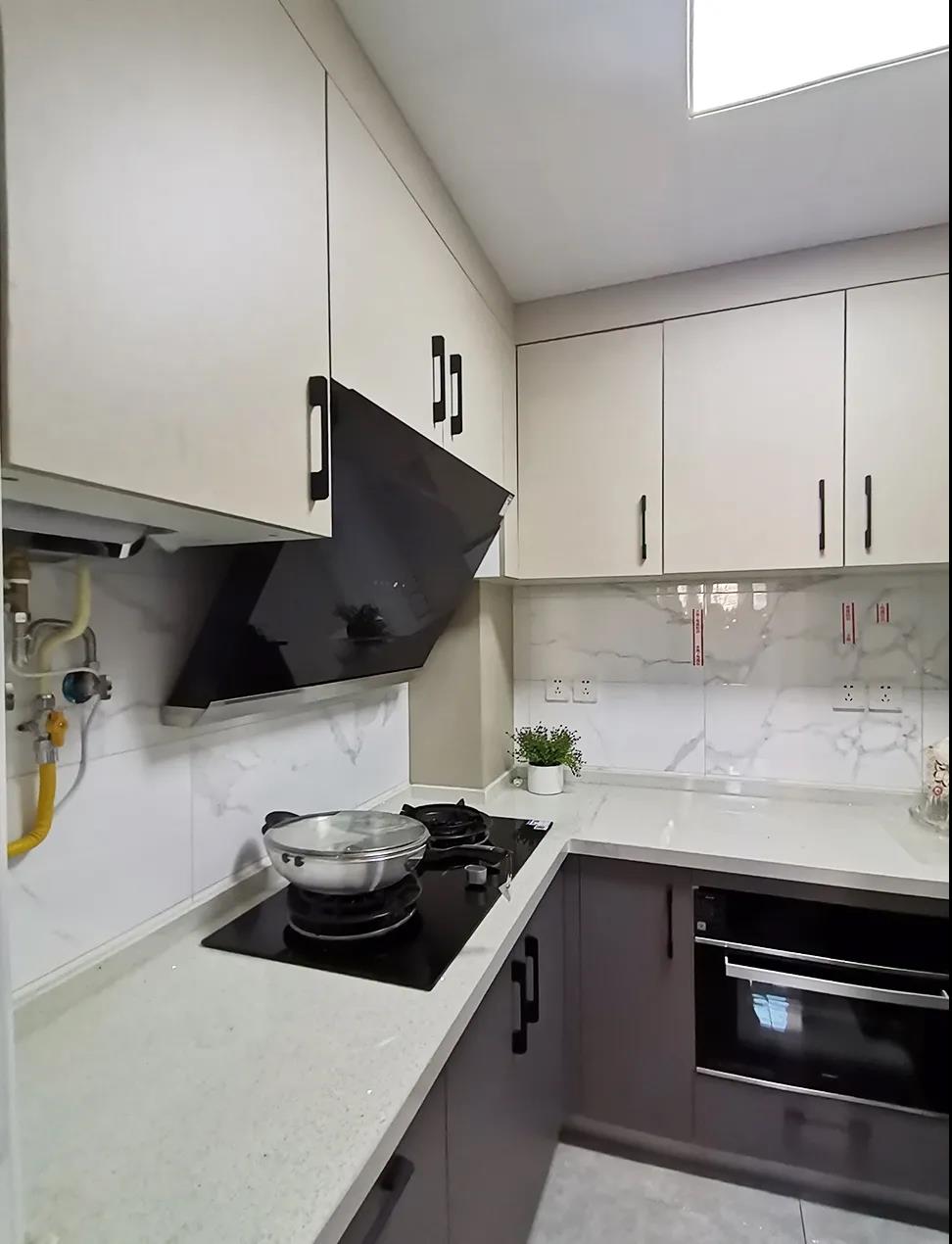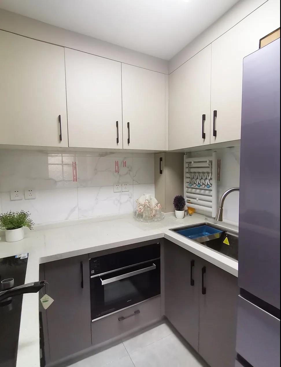 设计师将原厨房的门洞进行了封堵,开在了朝向阳台的方向,利用定制家具打造了一组u字形橱柜,储物空间充足,动线合理,光线明亮。冰箱也顺利入住,常用的小家电也都能摆放进来,方便好用。
