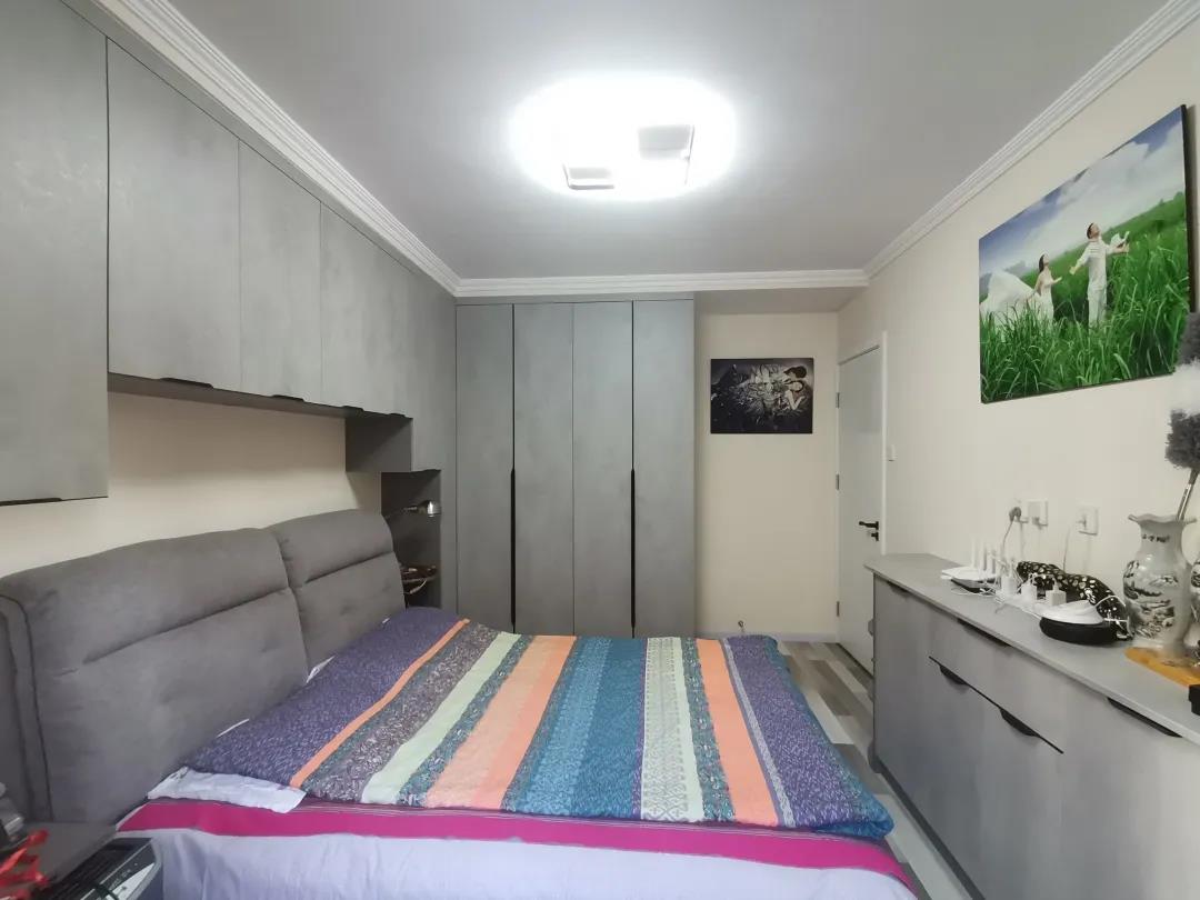 设计师将主次卧联通的阳台一分为二,分别匹配给了两间卧室,主卧是儿子儿媳的卧室,在这里利用定制家具打造了一组通顶衣柜,床头柜,矮柜实现了主卧休息储物的功能。
