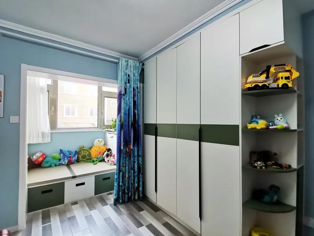 设计师拆掉了原有阳台的轻体墙,将这个空间从12平米扩大到16平米,利用定制家具,在儿童房同样实现了大容量储物,榻榻米、五斗柜,还有为两个孩子打造的衣柜,房间整体打造成梦幻海洋主题,美观且实用。