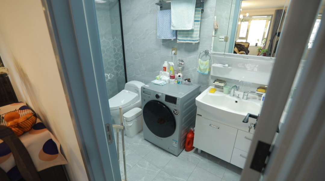 一字型的卫生间,设计师将使用频率最高的洗手池设置在了最靠门的位置,往里依次是洗衣机、马桶、淋浴房,动线合理,淋浴房使整个空间进行了干湿区域的划分。