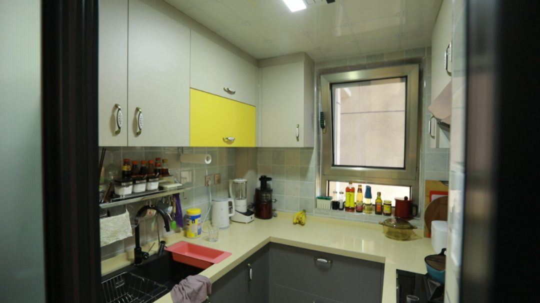 设计师将厨房的墙体延长了5厘米,冰箱外移到过道区域,这样,厨房里打造一组U字形的整体橱柜,洗切炒动线合理,储物功能强大,方便好用。