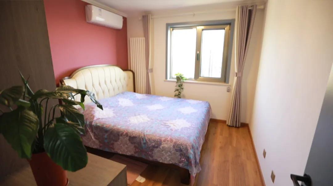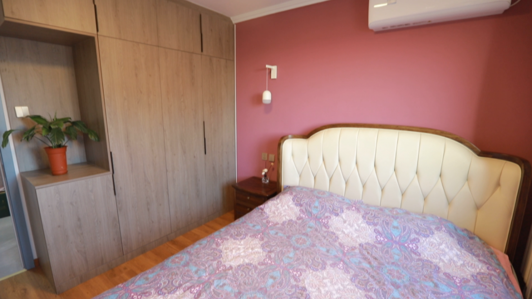 利用定制家具,在主卧实现了大容量储物,为金女士打造了专属的私密空间,暖色背景墙的设计,整体空间更加开阔、温馨。