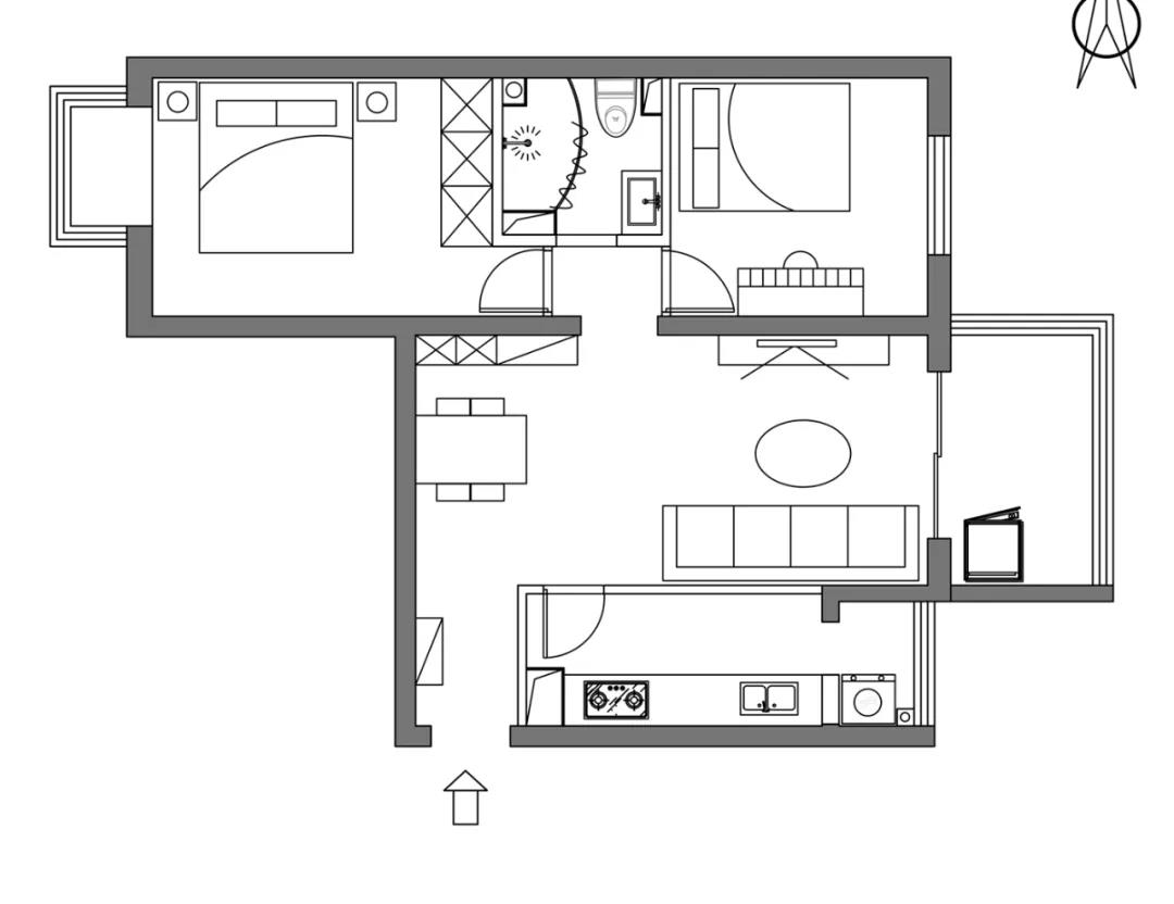 冰箱也移至厨房,厨房里拿、放、洗、切、炒,动线流畅合理。吧台的设计,既可以储物,也可以当作操作台,同时还可以当作临时的就餐台,一举多得,很是惬意。