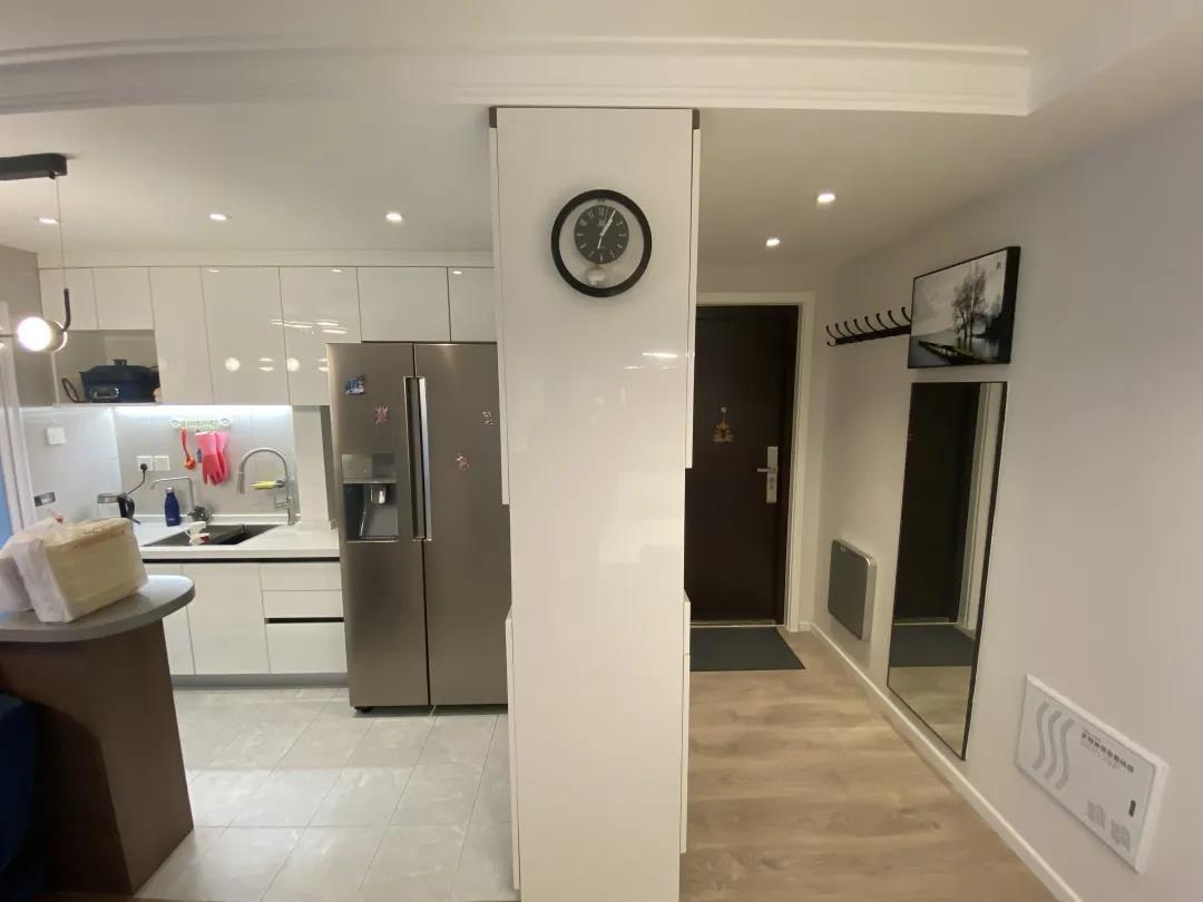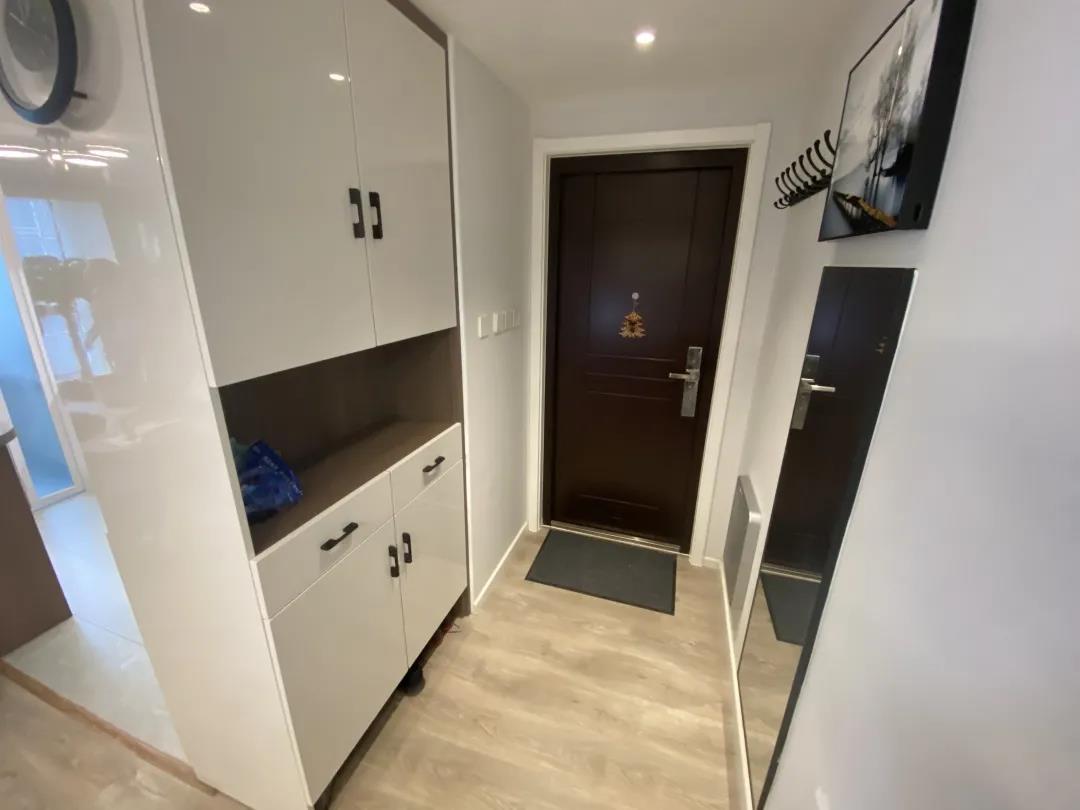 任先生家的门厅只有2平米,是个狭长形,改造前只在进门左手的位置摆放了一个简易鞋柜,再没有任何储物空间,而且放了鞋柜之后,进出都只能侧着身。再有进门右边就是厨房,还影响了这个空间的采光。希望设计师能合理规划门厅,既有充足的储物,又能解决采光问题,还能让老两口今出门有地方坐着换鞋。