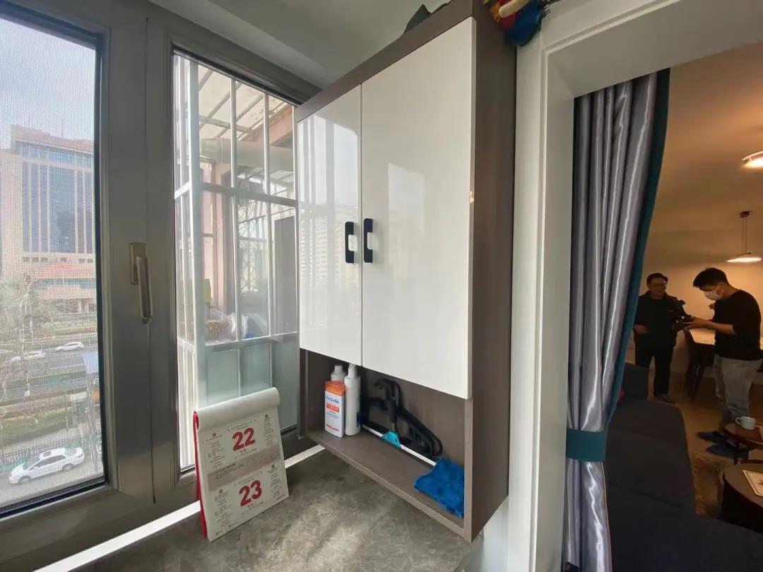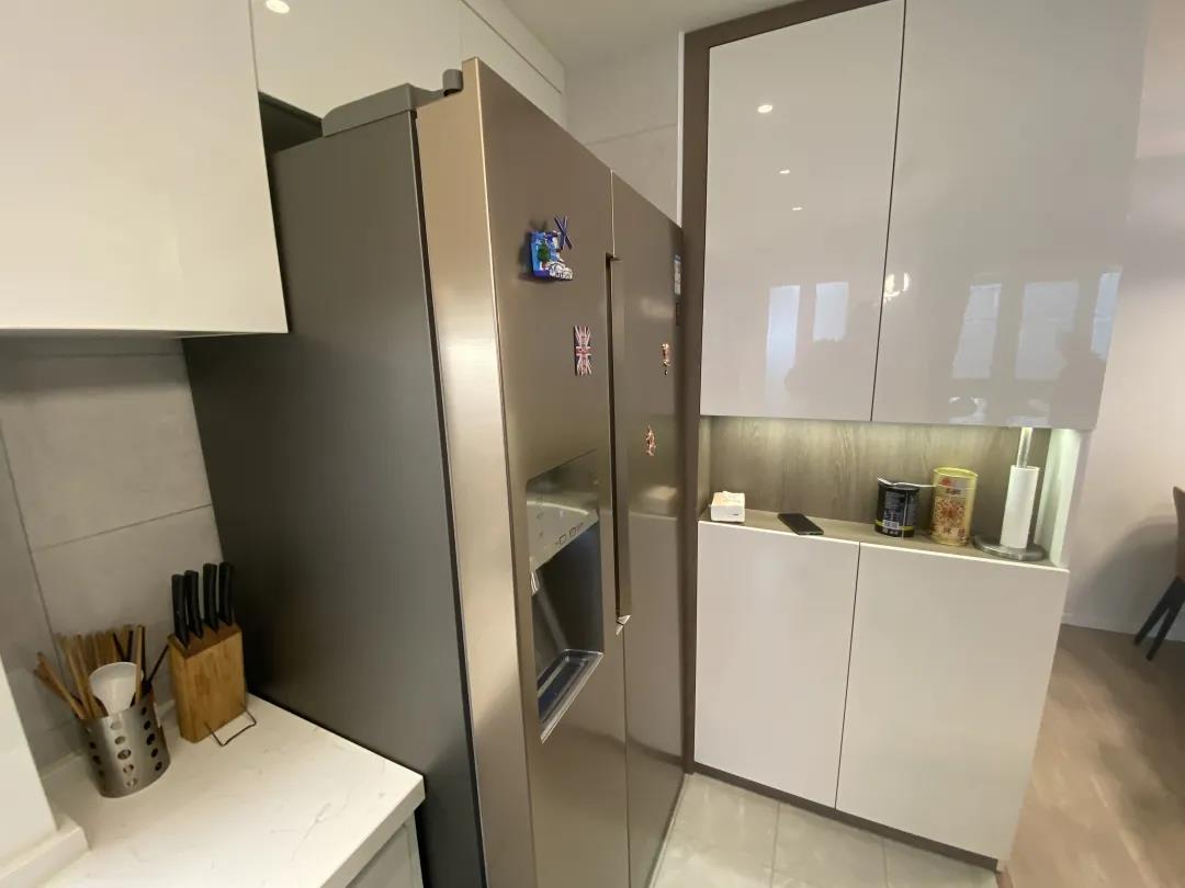 厨房改为开放式的,将烟机灶具移至和厨房连接的阳台,一组折叠门,打造了一个封闭式的炒菜区,阻隔油烟的同时给厨房节省出更多的储物、操作空间。