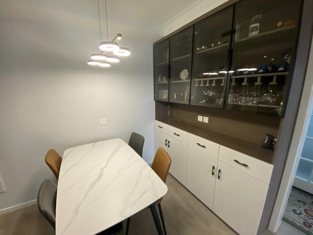 拆除原有客厅和阳台的推拉门,将阳台这5平米也纳入到餐客厅,将这23平米空间,进行了重新布局。餐区除了摆放餐桌外,还设计一组餐边柜,用来解决餐区储物。