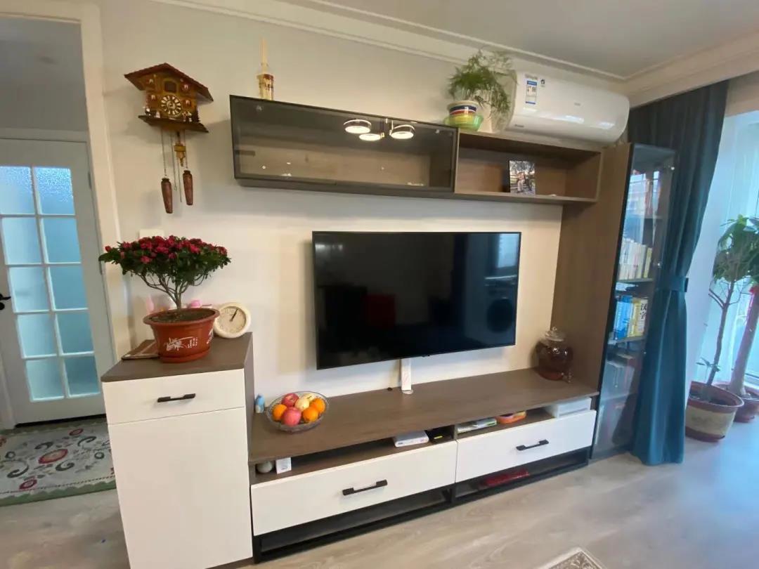 而客厅区域,用定制电视柜拉伸了整体的空间感,茶几沙发依次摆放,形成一种环抱的感觉,既温馨又实用。