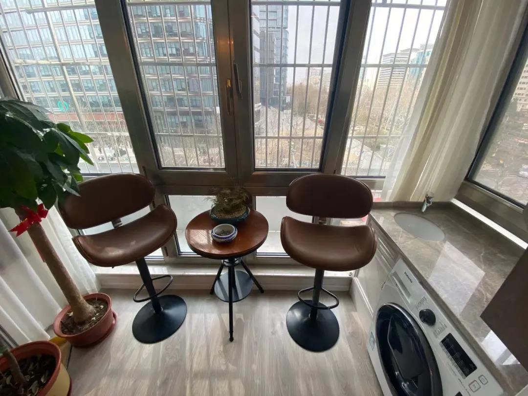 阳台区域设计师为业主打造了多功能的休闲区和晾晒区,洗衣、晾晒都很方便。利用定制家具,还打造了一组阳台柜,存放日常的洗衣用品。曾经闲置的区域,摇身一变成了兼具休闲、洗衣、晾晒、储物的多功能空间。