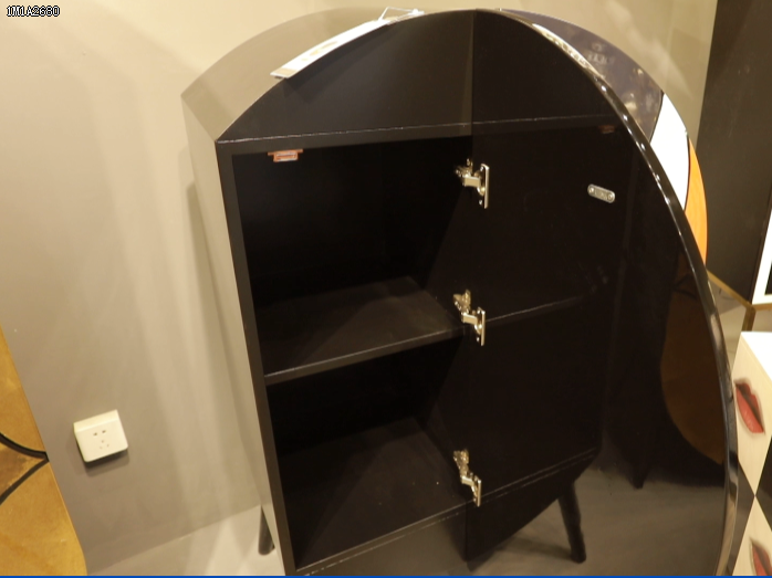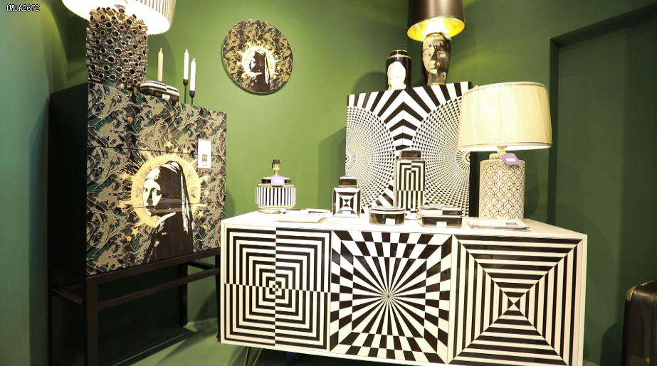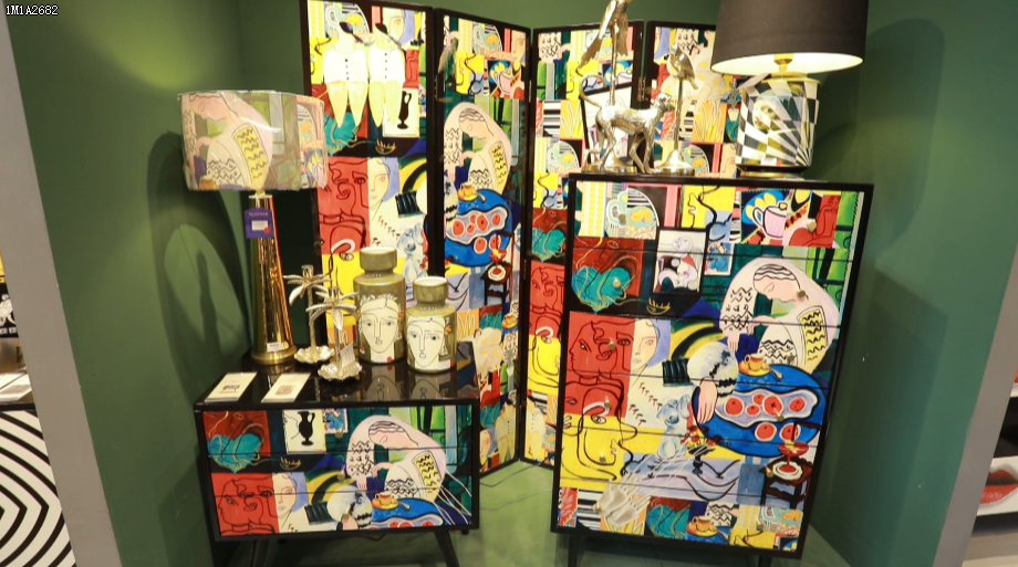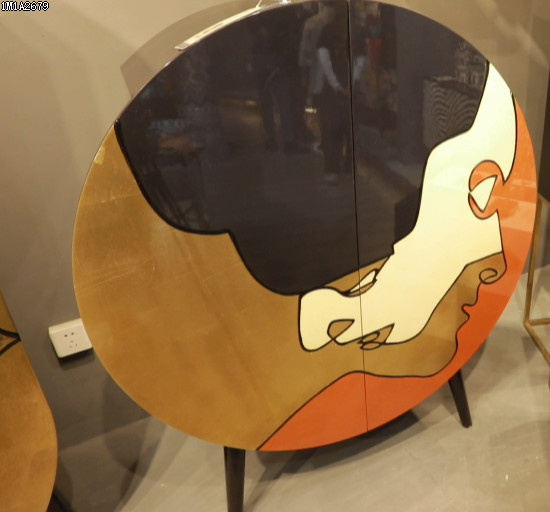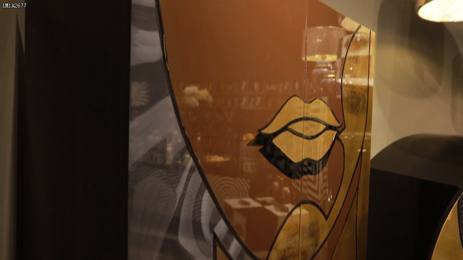 这组展品的风格主要以现代抽象风格作为基本元素,主要材质是高密度压合板,脚架为纯实木,表层为手绘、贴花纸等混合工艺。有别于传统的柜子,这组柜子的表层主要凸显它的不同风格,所做的工艺基本有三种,第一种是手绘,就是工人师傅可以根据图案画上去。第二种是可以在表层做一些贴花纸,然后表层做烤漆。第三种是把它混合,既有手绘的部分,也会有贴花纸的部分。