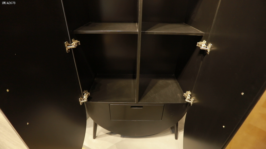 这组展品是两个竖柜,您可以看到它细密的纹路,有明显手绘的痕迹,它是画笔蘸了画料以后,在表层有很明显走过的痕迹。它的特色就在于它的原生态,还有就是体现出来的它本身的艺术感,以抽象风格为主体,所营造出来的简单、抽象、现代风格。其主要材质是高密度压合板,里面底层支持定制,根据客户需求可以做成两层、三层或四层等。