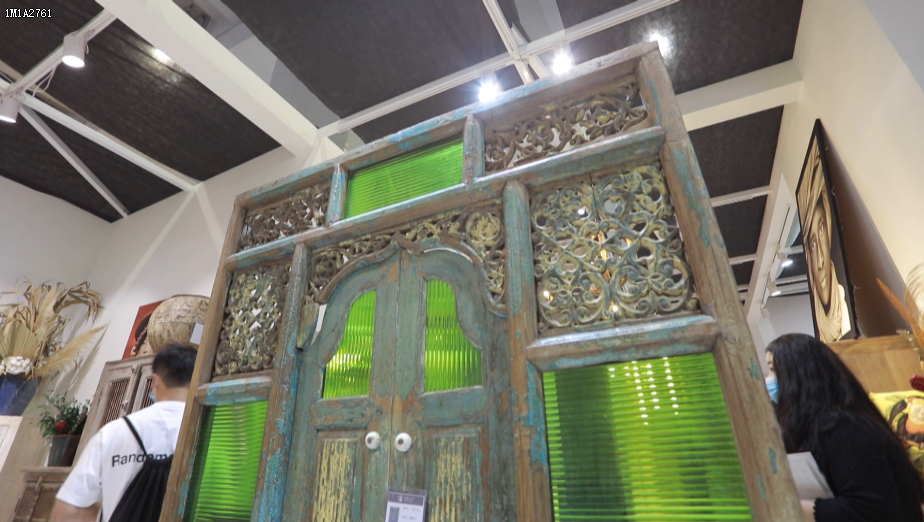 像这个展品,在古代一百多年前是一个门,它的门分成室外门和室内门两种,其实它在当时也是一个窗,比如说把中间打开,它就是一扇窗。周围镂空的雕花,是具有当地的设计元素和传统设计理念的,这种设计在当地叫做嘉里。门上的玻璃,并不是机器制作的,它有很强的肌理感,这种彩色带质感的玻璃,现在是非常少见的。
