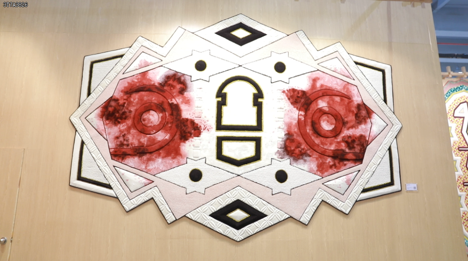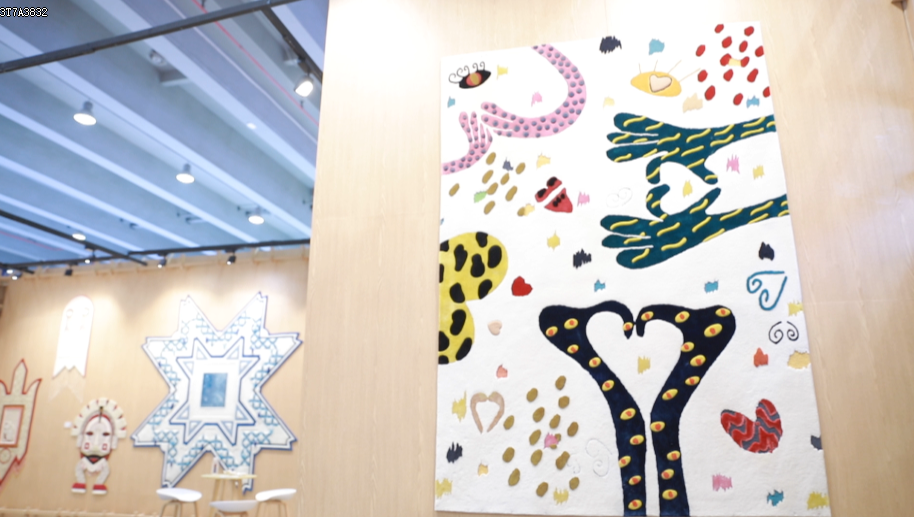 这张地毯是由美国的一个空间装饰艺术家JOJO王设计的一个产品,他的灵感来源是他的女儿的一幅画作,他在画作上面再做了一个再创作。