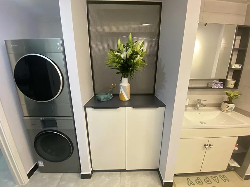 由于被门厅借用了部分面积,被压缩后的卫生间有2.3平米,设计师在这里保留了如厕和淋浴的功能。借用原本客厅和卧室的部分空间,修建两面U字型墙体,一面规划为洗漱区,另一面放置了洗衣机和烘干机,实现了干湿分区,解决了洗衣难题。