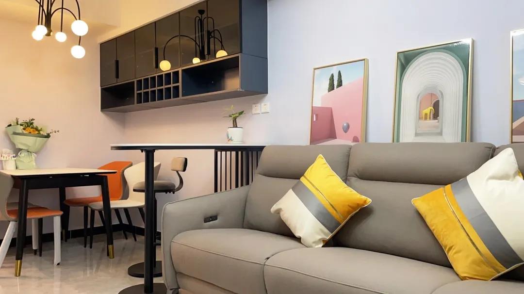 设计师将原本15平米的主卧改造成了客餐厅,沙发、电视柜依次摆放。用餐空间,设计师选择了餐边吊柜来帮助一家人实现大容量储物,餐区与客厅中间用一组小吧台作为区域划分,整体空间温馨、舒适。