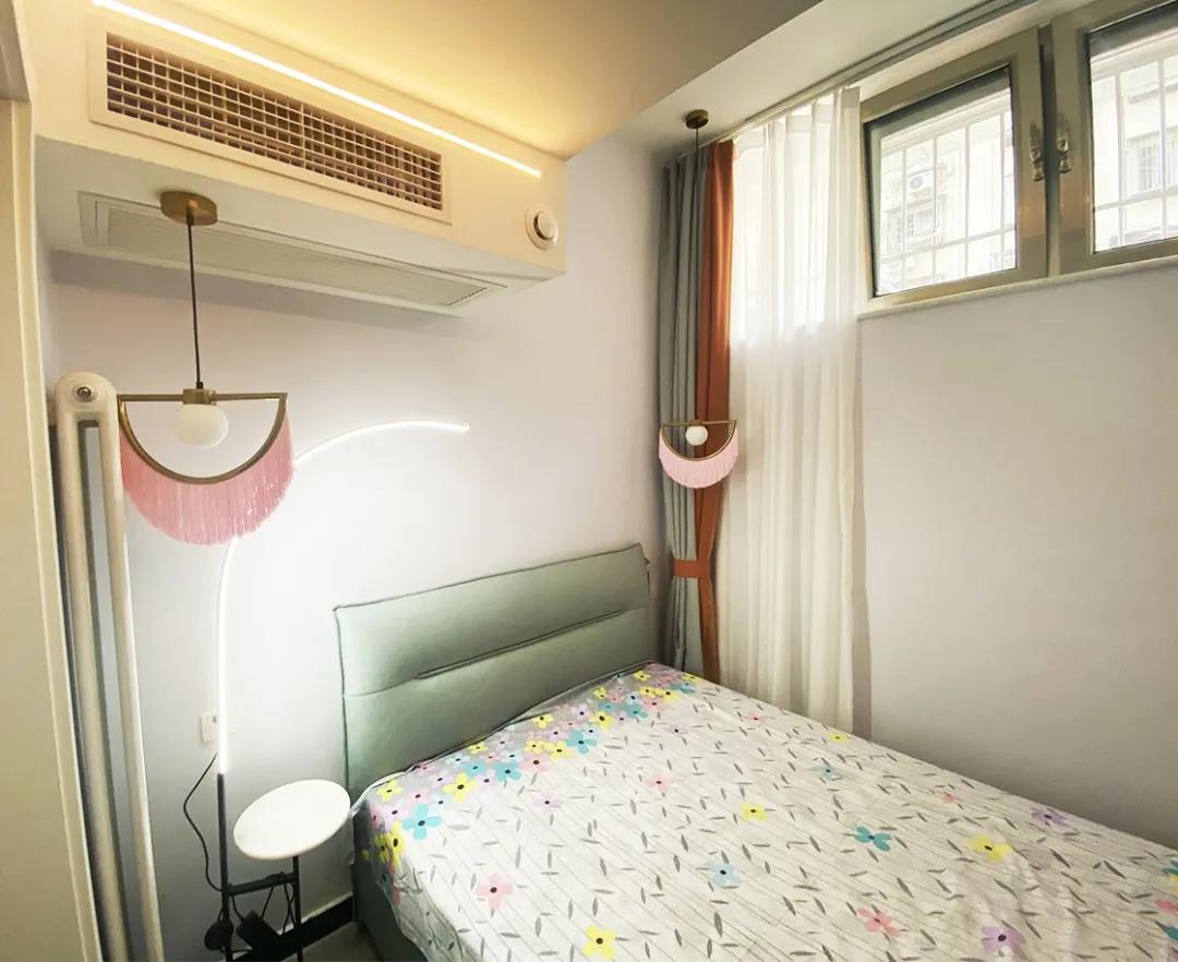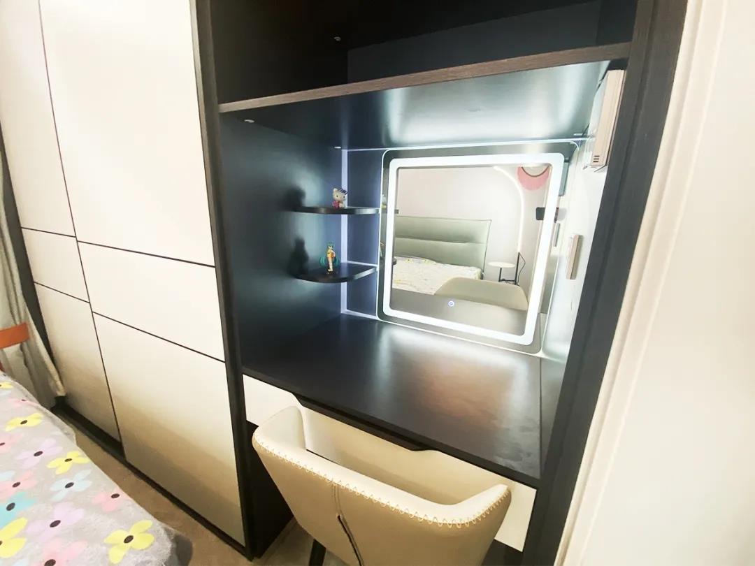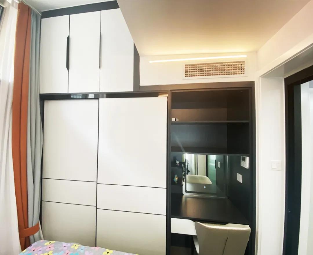 设计师将这间卧室重新调整,一整面的通顶衣帽柜满足了卧室的储物需求,而梳妆台也是必不可少。
