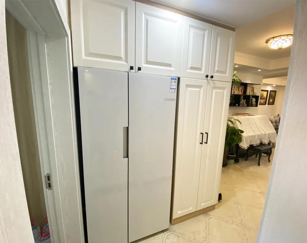 设计师封堵了进门正对面厨房的门洞,这里就有了一面完整的墙,打造了入户玄关。进门右手边沿墙体,一组L形整体定制衣帽柜,集出门鞋帽柜、日常储物、冰箱于一体。
