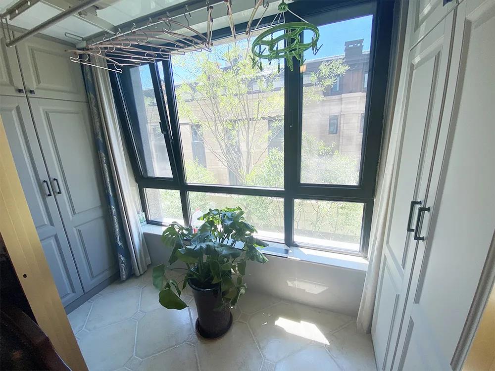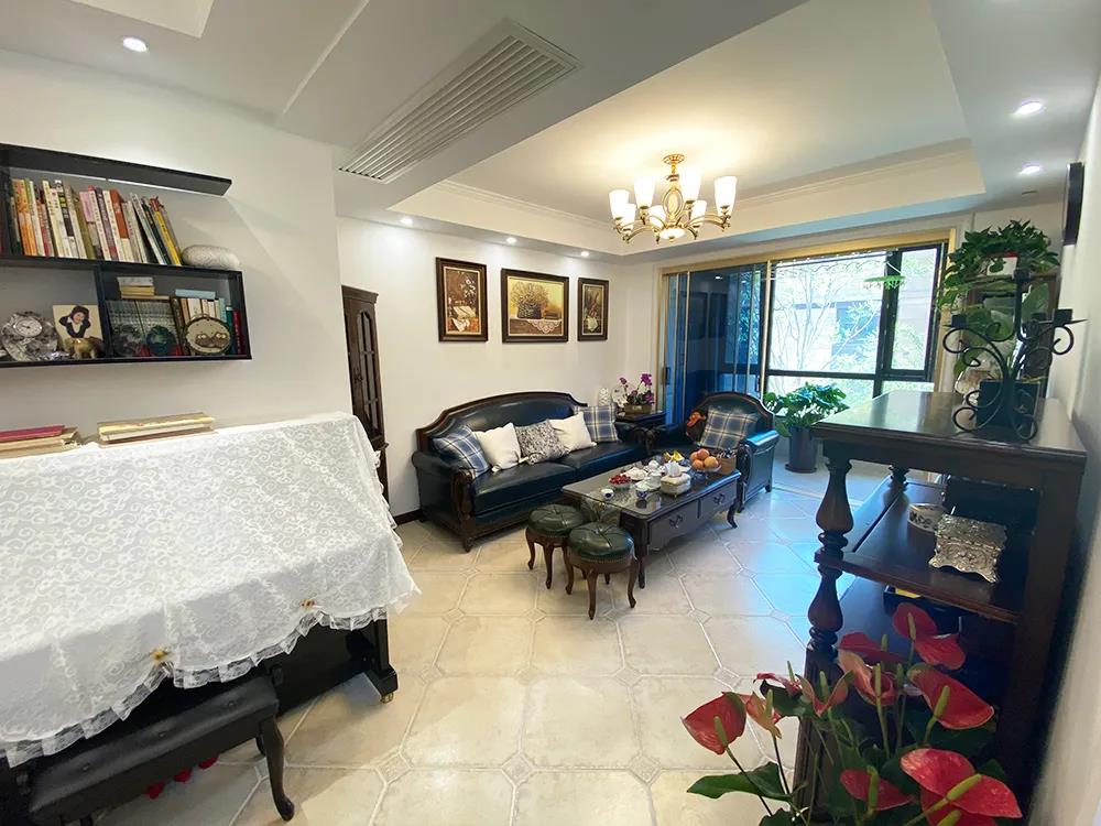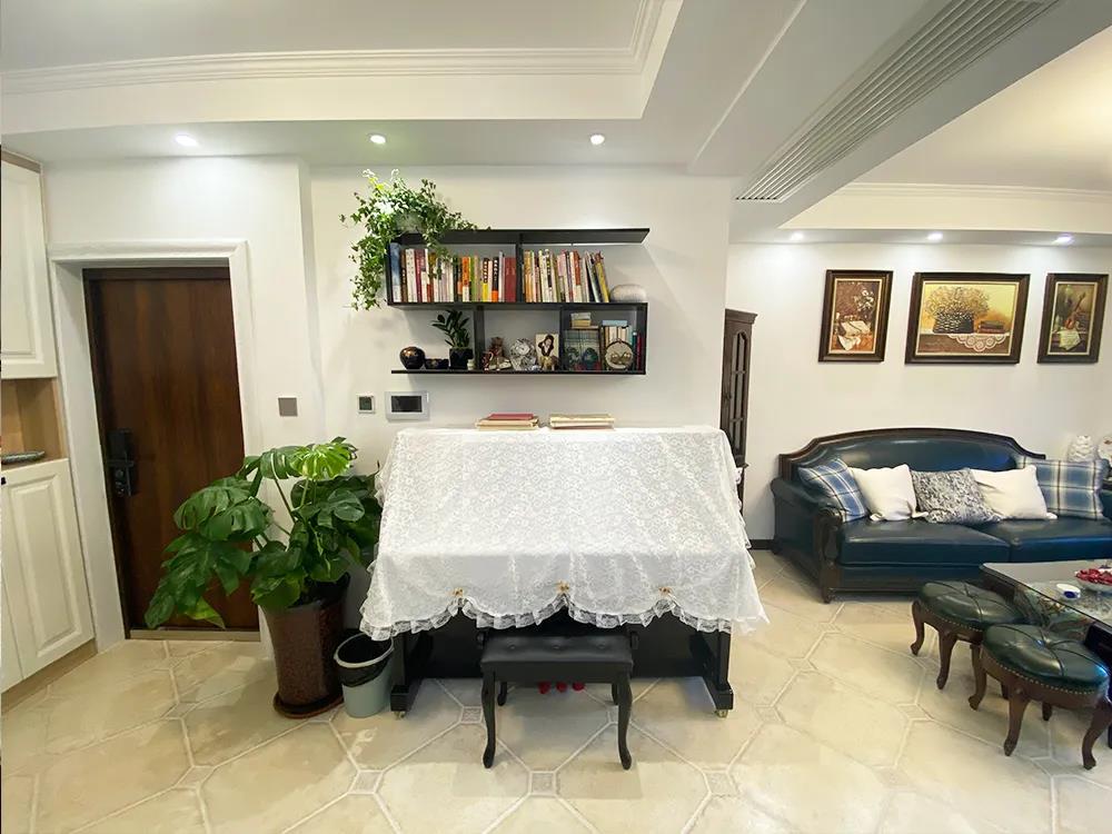 设计师将14平米的客厅打造成李女士喜爱的美式风格,沙发、茶几、电视柜、角柜一应俱全。为了方便晾晒,结合业主的需求,设计师保留了阳台功能,利用金色窄边推拉门进行隔断设计,在阳台的两边利用定制家具打造了两组通顶储物柜,来补充客厅的储物,整体空间美观、实用。