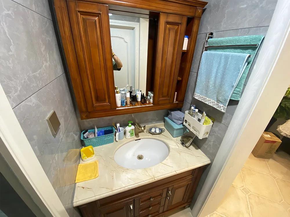 卫生间将近4平米,要满足淋浴、如厕、洗漱、洗衣4大功能,空间过于局促,李女士想要个干湿分离的卫生间,并且增加足够的储物空间。