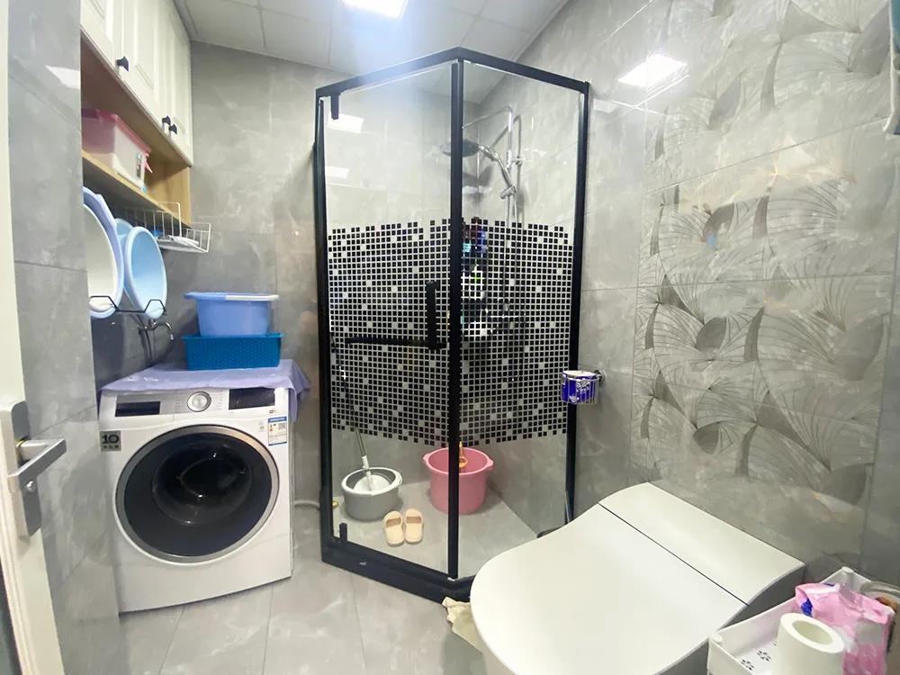 为了实现干湿分区,设计师将过道的1.7平米,也纳入到卫生间功能区,将洗手盆外移到这里,而卫生间里保留了淋浴、如厕和洗衣三大功能,还利用定制家具在洗衣机的上方打造了一组储物柜,大大提高了卫生间的储物功能。