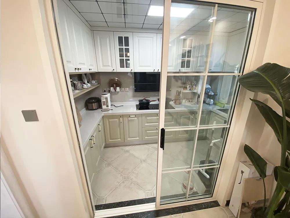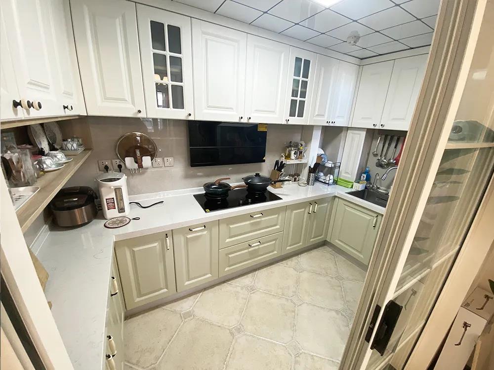 设计师封堵了厨房原有的门洞,将新的门洞开在另一侧,一组U字形橱柜,满足大容量储物的同时,还增加了不少造作空间,推拉门的设计则挡住了厨房的油烟进入餐厅。
