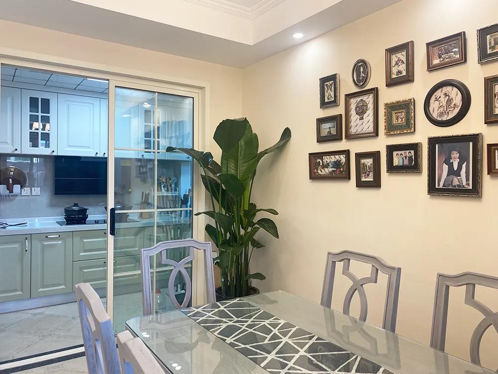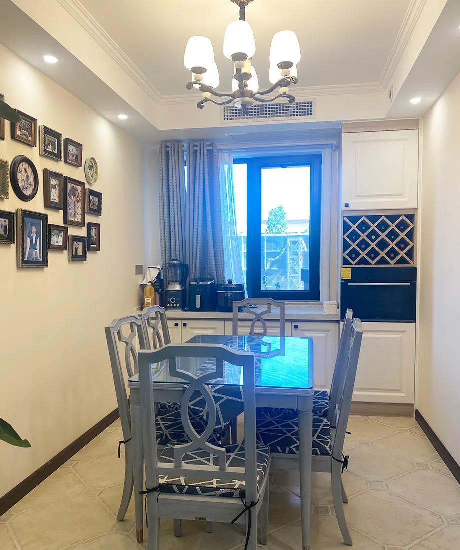 设计师将距离厨房最近的这间次卧室打造成了用餐空间,6人位餐桌大大满足了业主和朋友的用餐需求,一组L形餐边电器柜,拓展了餐区的储物,小家电和红酒也有了摆放的位置,整体空间,温馨、实用。