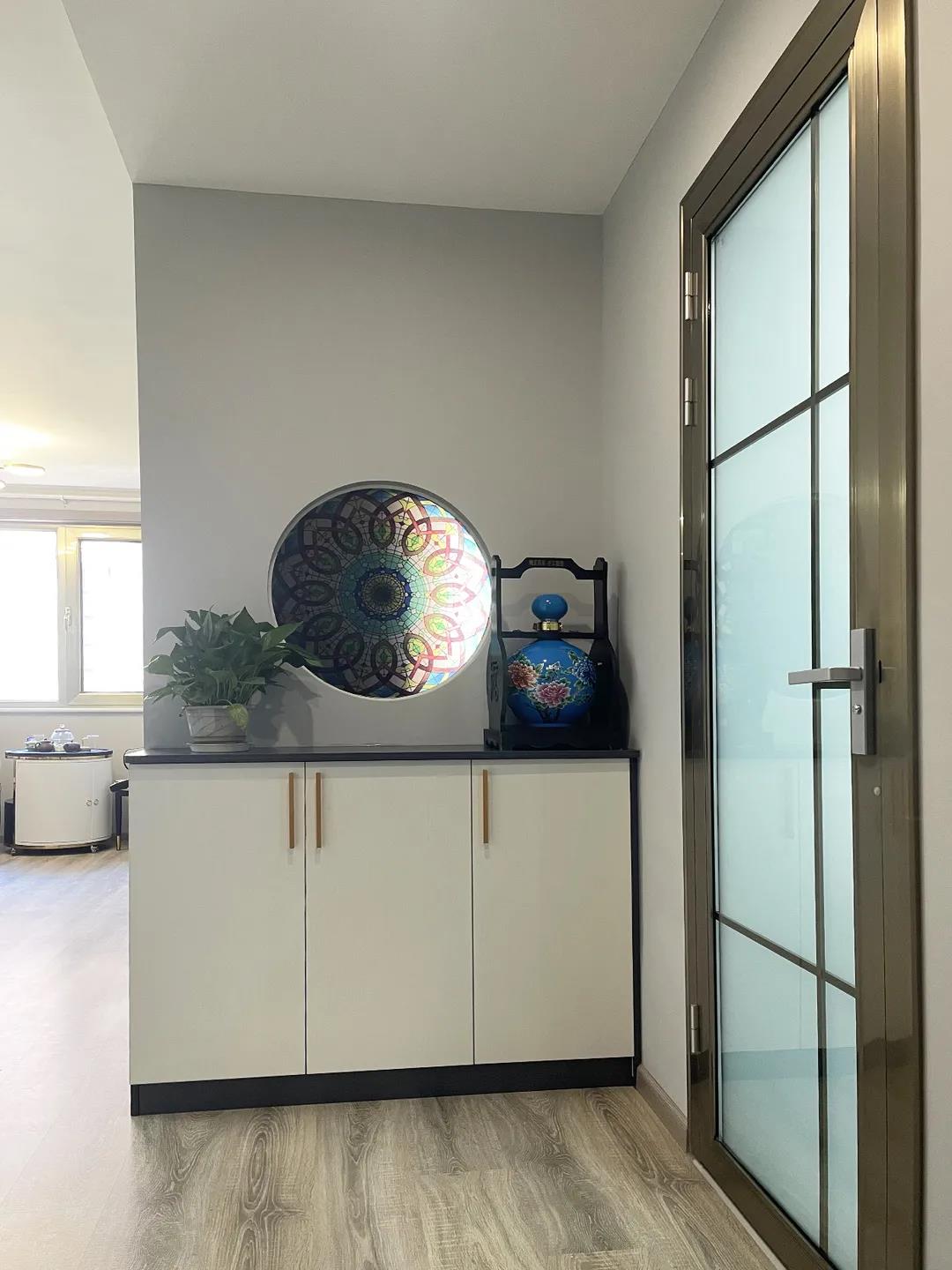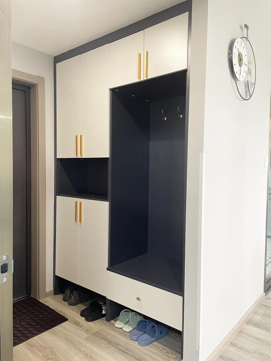 为了能够实现独立、完整、好用的玄关,设计师在进门的左手边新建了隔断墙,封堵了原来正对入户门的主卧室门,并且将这面墙向卫生间与入户门方向移动了70厘米。调整了几面墙体后,就有了一个4.7平米的门厅。这样,有了门厅的储物,有了养眼的玄关。而且让整个居室空间隐私性更强。