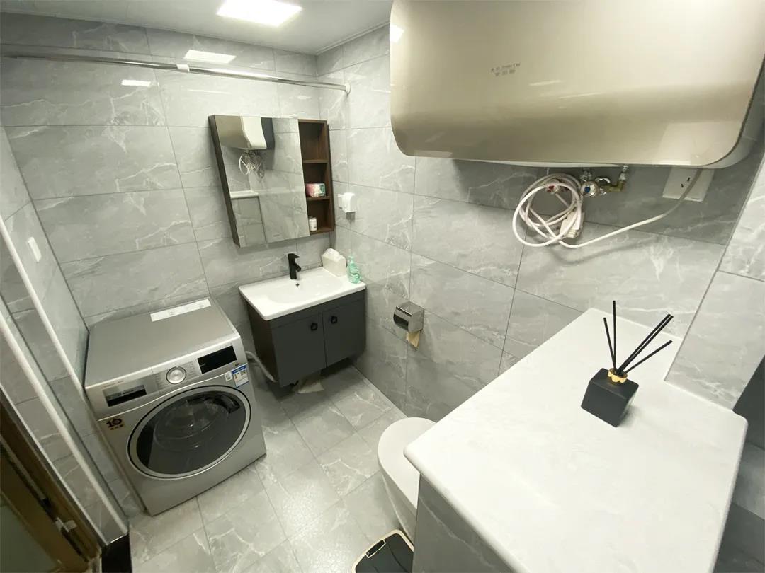 由于挪动了墙体,卫生间面积被压缩了,但经过设计师突破常规的布局,卫生间实现了干湿分离,壁挂马桶和洗手盆的设计,让整个空间没有卫生死角,方便打理。