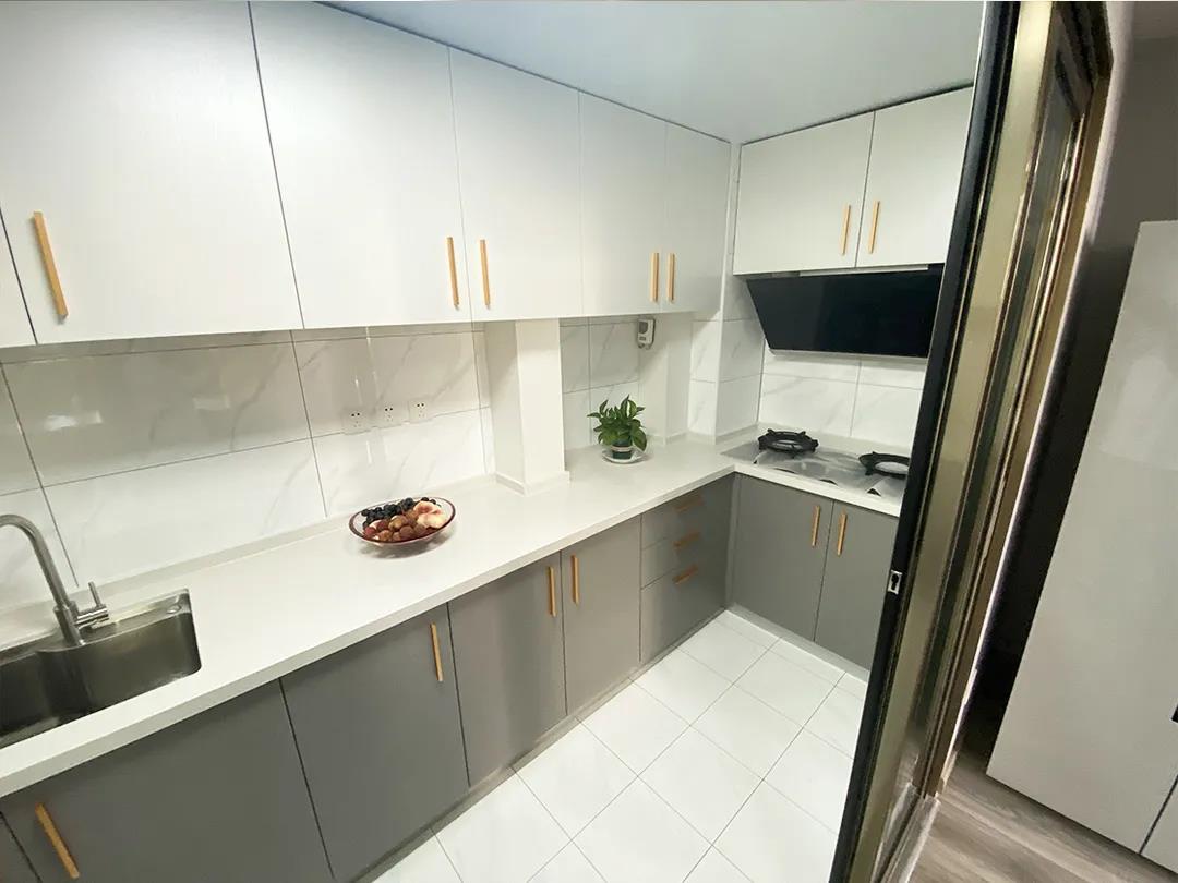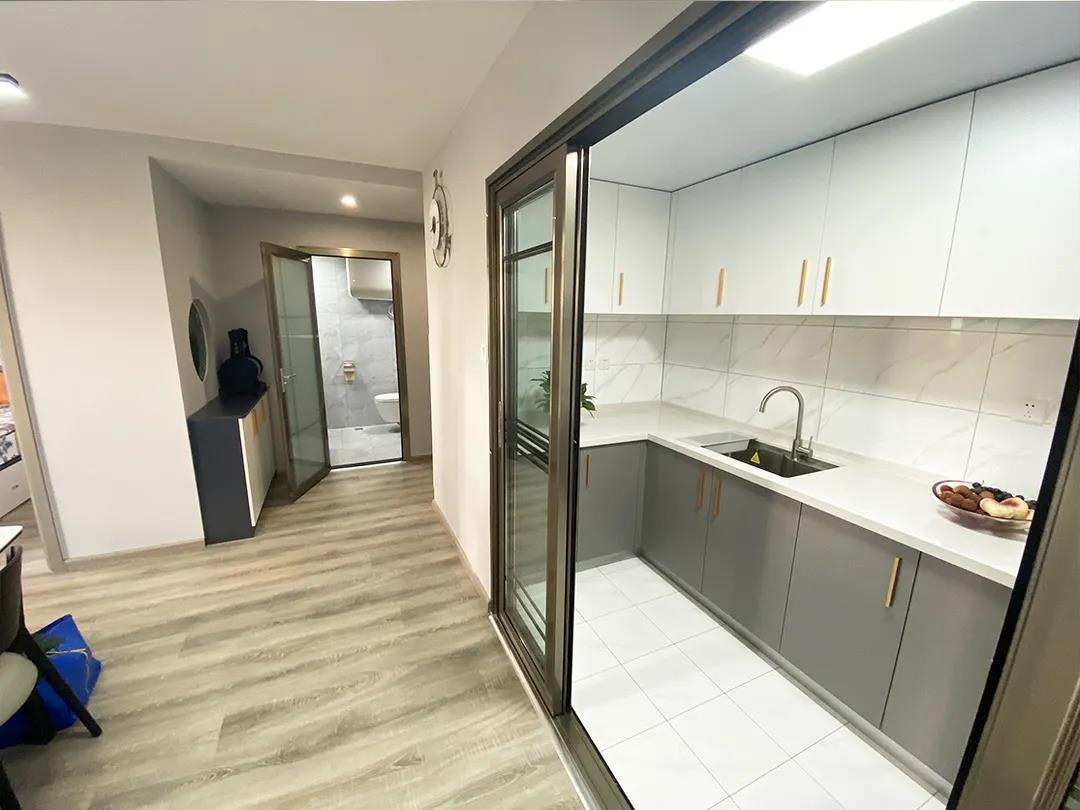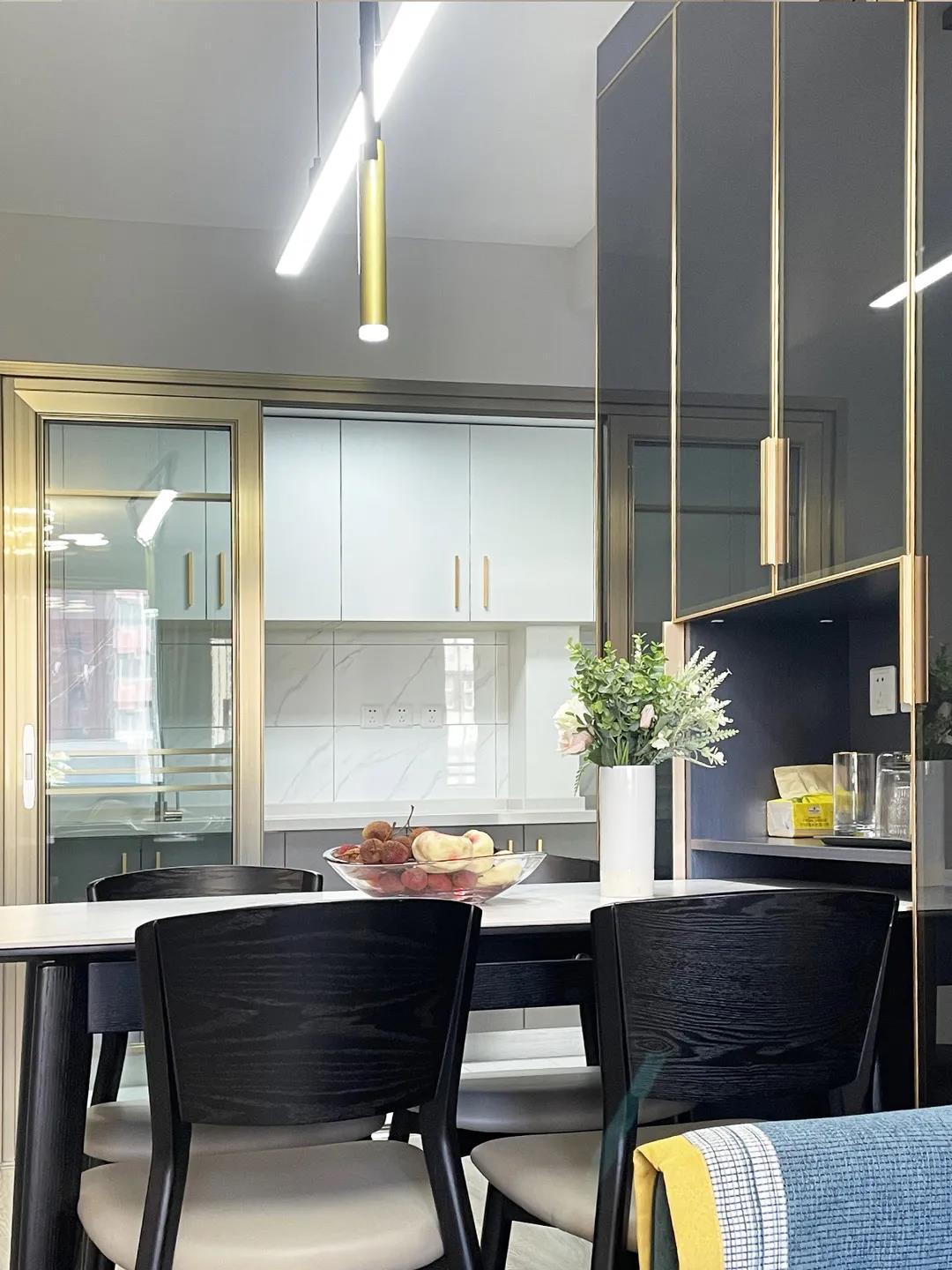 设计师将原有的厨房空间变换了位置, U字形橱柜的设计,满足大容量储物的同时,还增加了不少造作空间。铝合金玻璃推拉门的设计,让厨房可封闭可开放,可以根据不同的场景需求来改变。原有的厨房阳台打造成了晾晒区,解决了业主未来的晾衣问题。