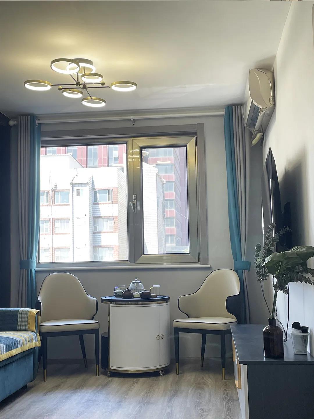 设计师将客卧的一面墙体进行拆除,把这部分区域规划到客厅空间,在这里打造了餐区。通顶餐边柜方便收纳,又能起到展示作用。沙发和电视柜也终于能正对摆放,而且在这里还为谢先生打造了休闲区,与朋友品茶聊天,十分惬意。旁边还打造了一组通顶储物柜,来补充客厅的储物,整体空间美观、实用。