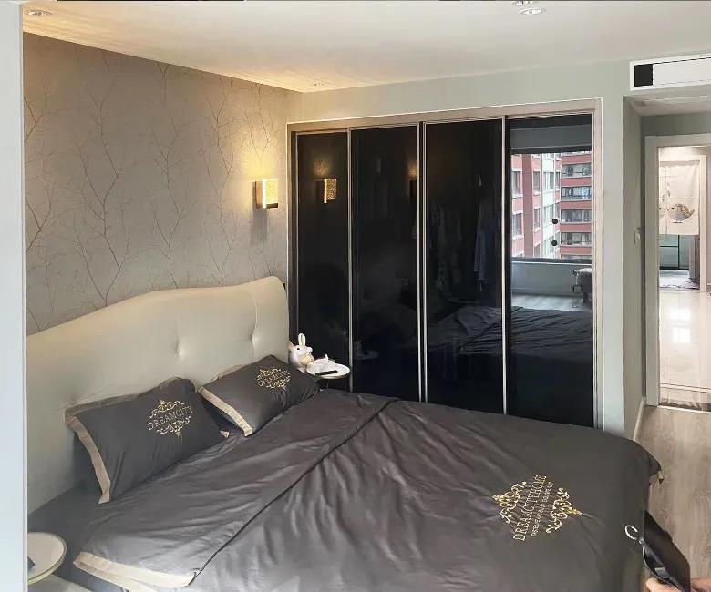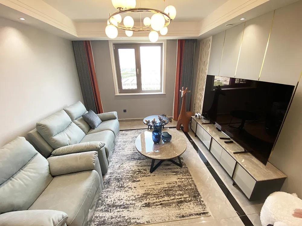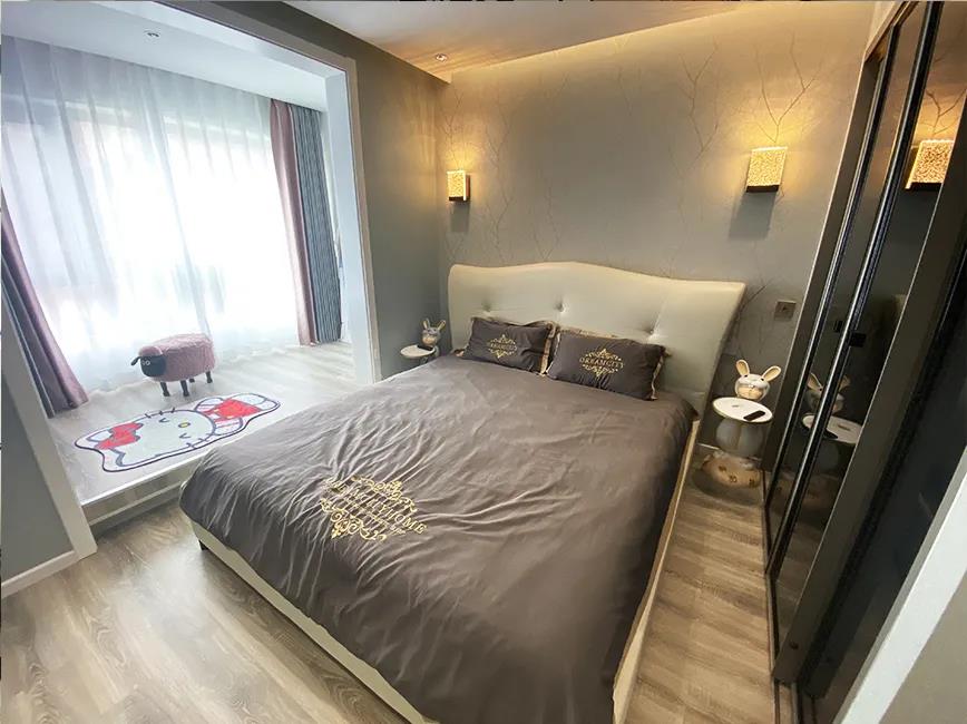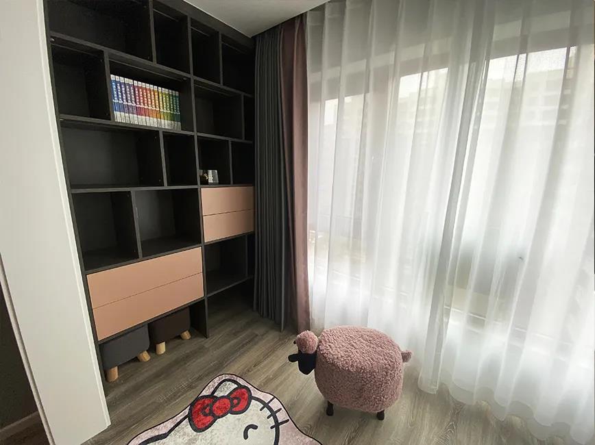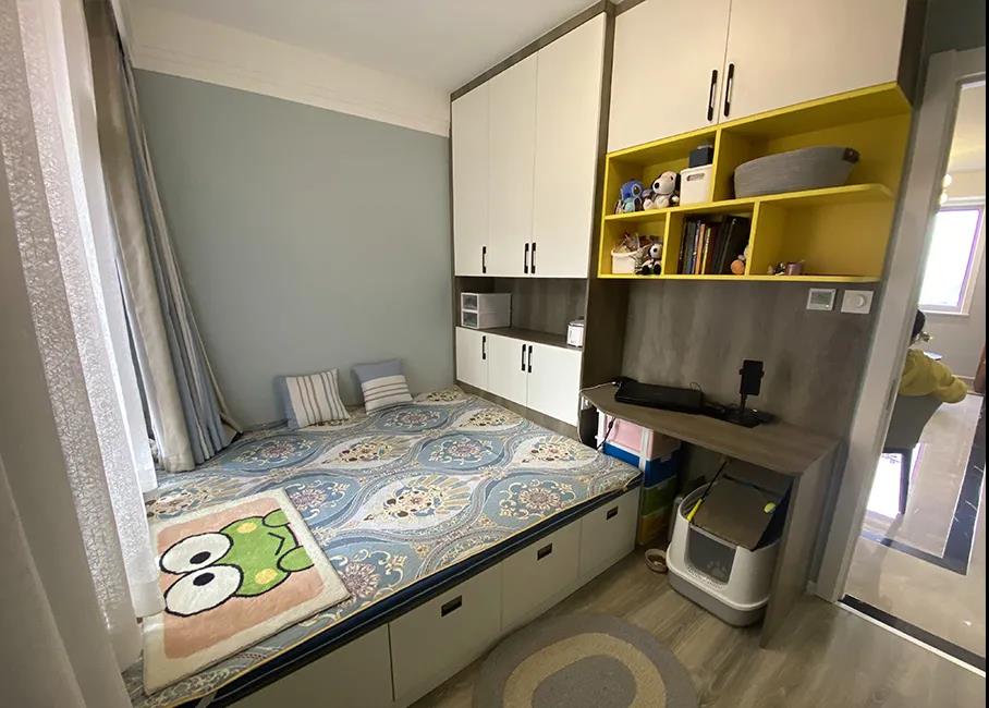 设计师将原有的客厅规划成客房加书房,榻榻米的设计增加大容量储物功能,利用AG真人的定制家具,打造了一体式学习区域,为张女士的第三代也进行了空间预留,整体空间明亮、简洁。