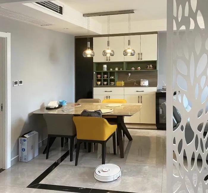 设计师拆除原有客厅与书房之间的轻体墙,在距离这面墙6米左右的位置,新建一面墙,将这20平米的空间规划成了新的餐客厅,给客厅和餐厅都找到了最佳位置,空间整体宽敞明亮。而剩下的空间,则规划成了新的书房。