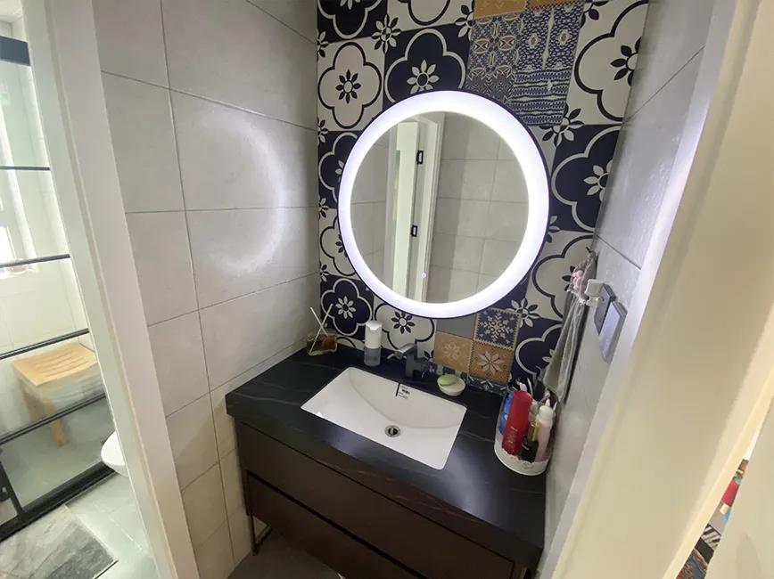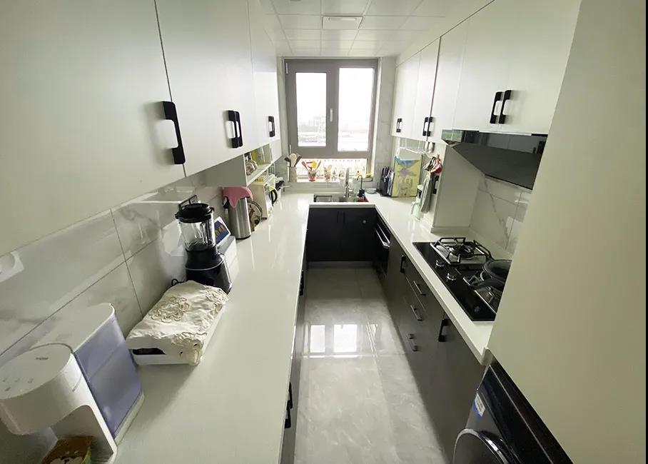 设计师拆除原有厨房和阳台不承重的推拉门,厨房空间扩大到将近9平米, U字形橱柜的设计,满足大容量储物的同时,还增加了不少造作空间,张女士平时使用的各种小家电都实现了合理摆放。滤水、净水系统也全都实现了,再来看看改造后的卫生间。