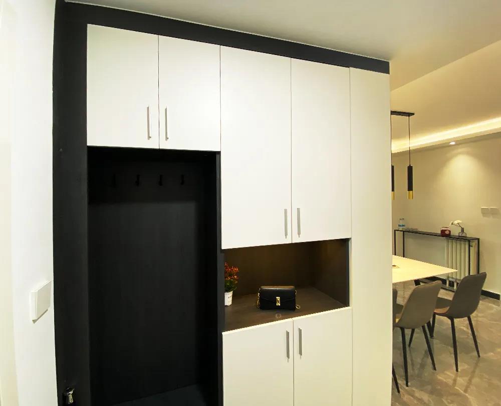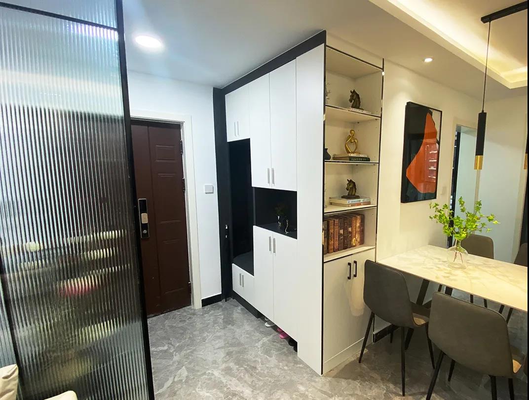 为了解决门厅采光差,缺少储物的难题,设计师将入户门正对的轻体墙更换成长虹玻璃,既起到了隔断作用,保护了隐私,又解决了采光难题。同时封堵原有厨房门,在这里打造了一组通顶鞋帽柜,解决了一家人进出的储物收纳难题。