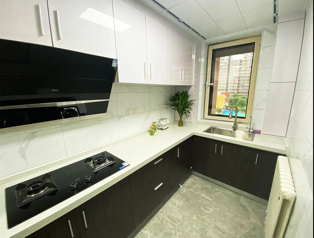 设计师封堵原有厨房门洞后,用定制家具代替隔断墙,同时将厨房门改在另一侧,并且采用了节省空间的铝合金推拉门。为厨房里节省了不少空间。将双开门冰箱嵌入原有的门洞内,一组L形橱柜,满足大容量储物的同时,还增加了不少操作空间。