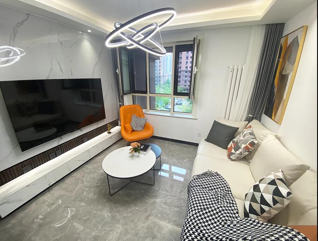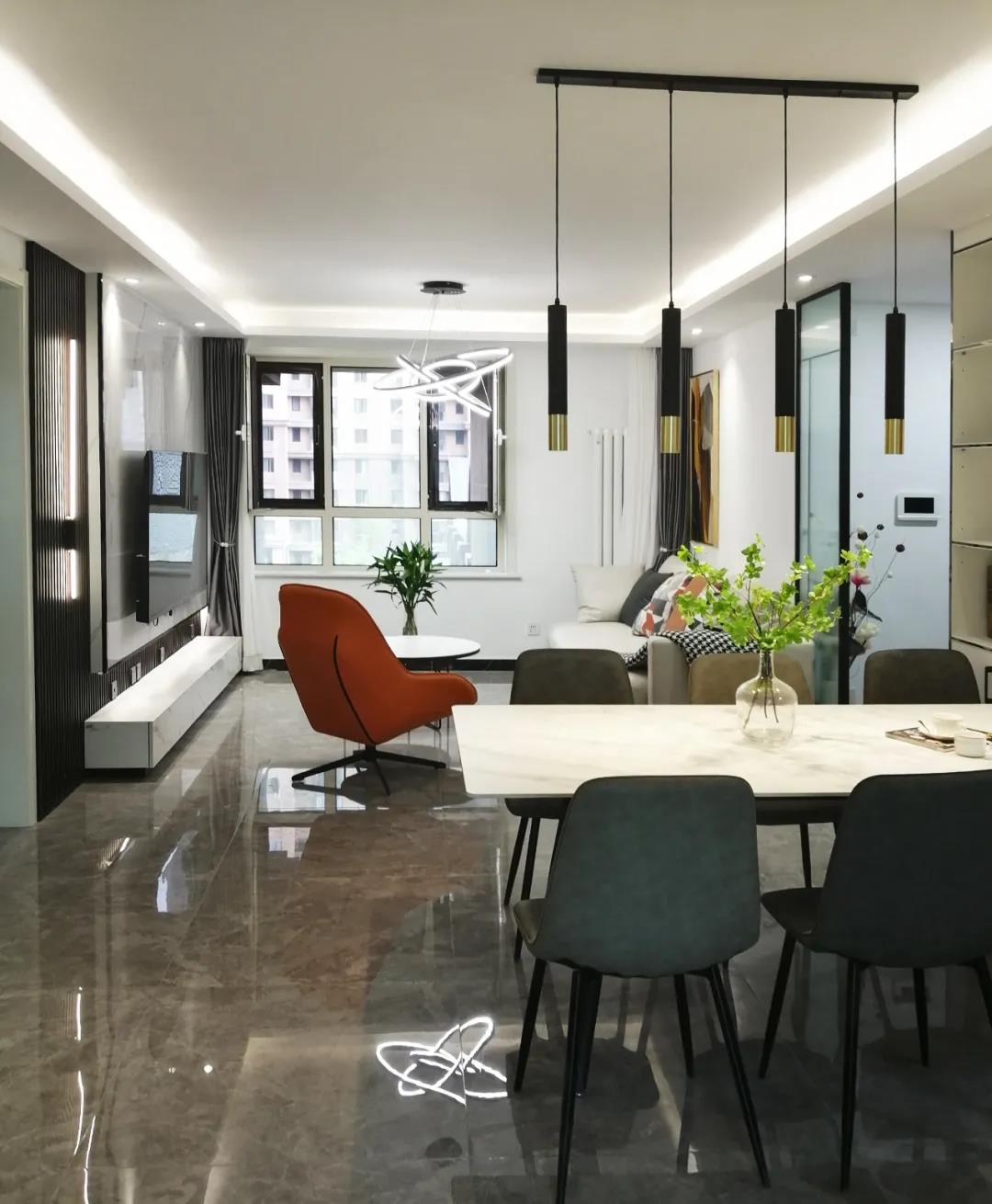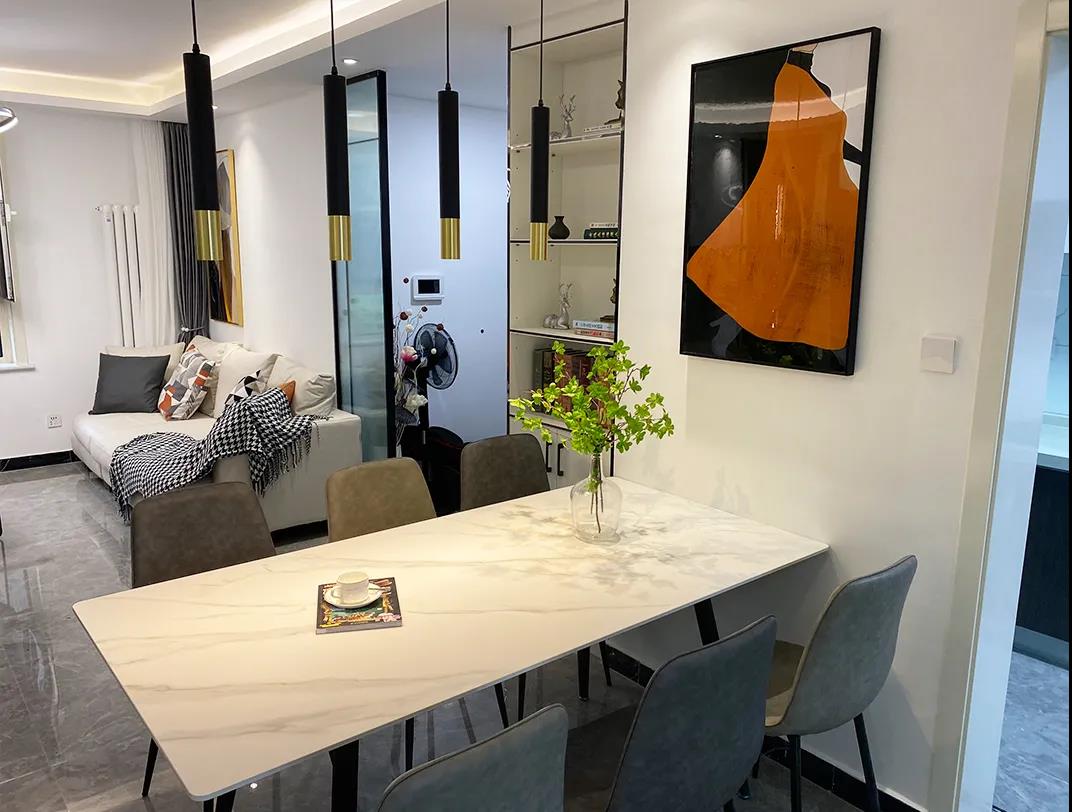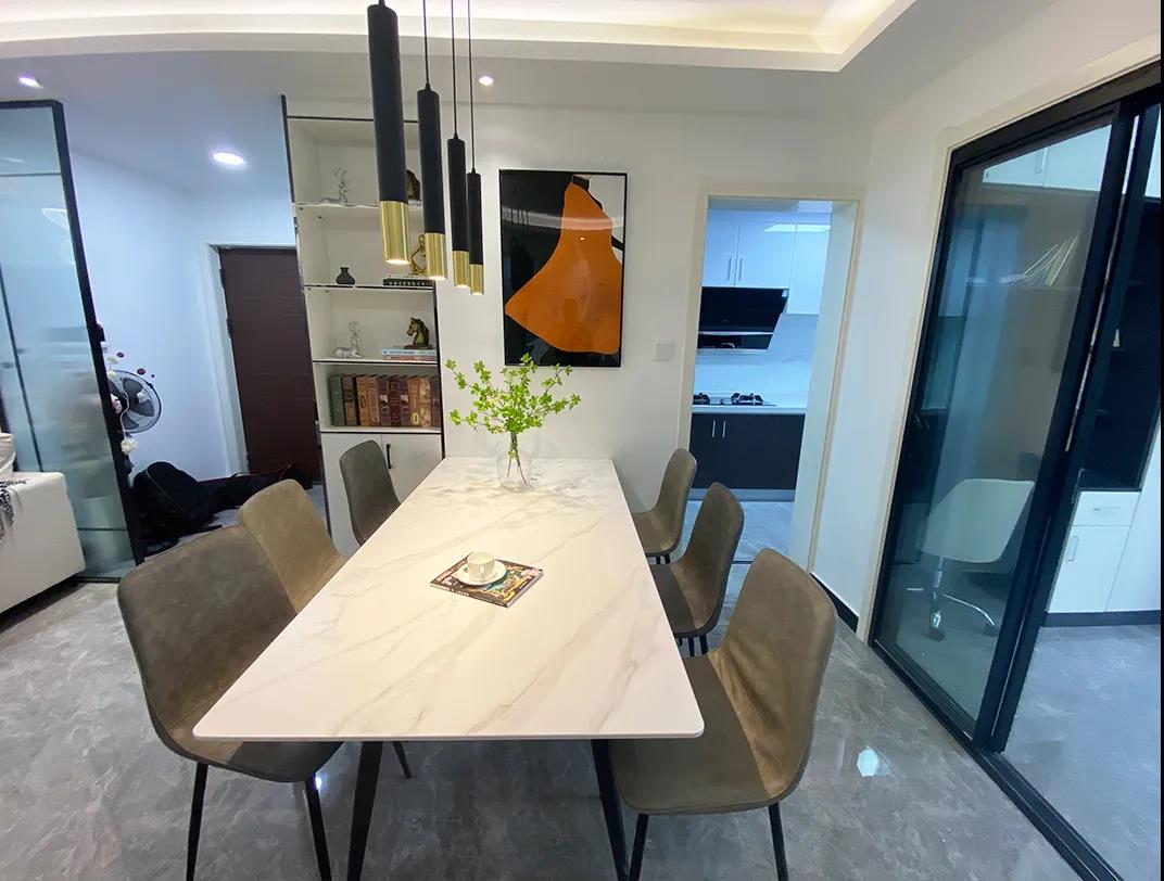 设计师将原有次卧与客厅相邻的轻体墙向卧室方向挪动了80厘米,客厅从22平米扩大到25平米,沙发、茶几、电视柜依次摆放。同时,在这里规划了用餐区域,1.8米乘以90厘米的多人位岩板餐桌,满足赵女士亲戚朋友来家聚会的需求,借助玄关柜的侧面,设计师也为餐区进行了餐边柜的设计,改造后的餐客厅,通透、明亮。