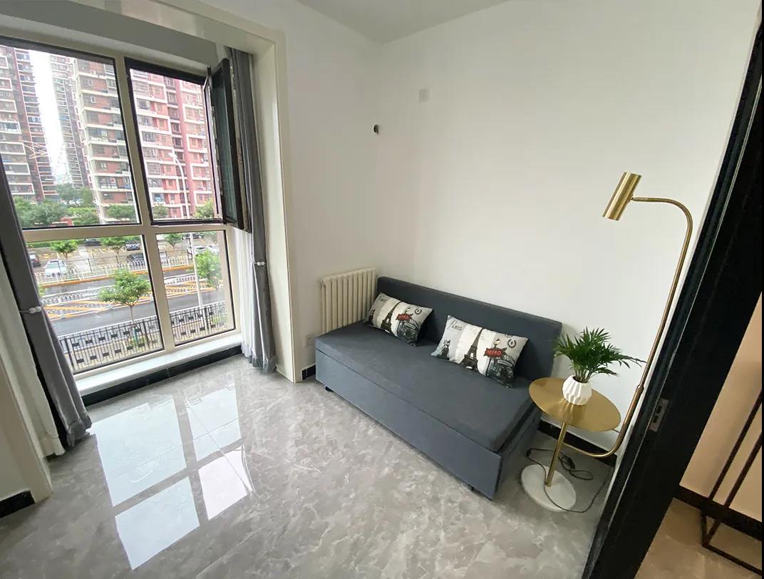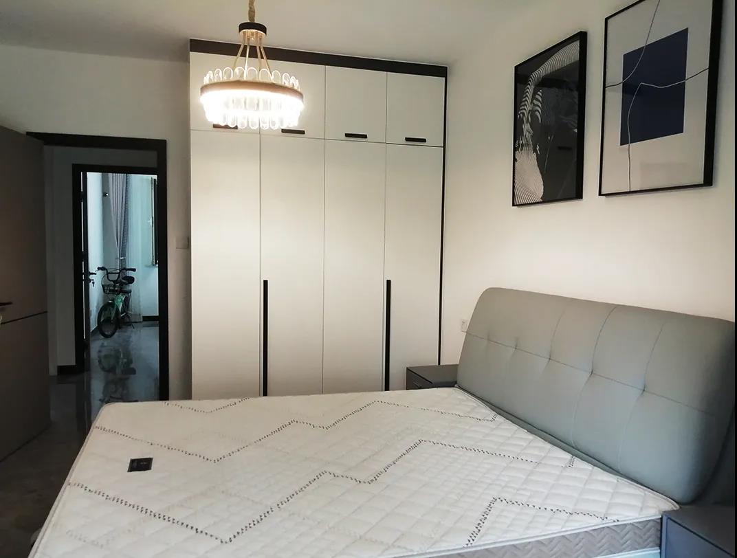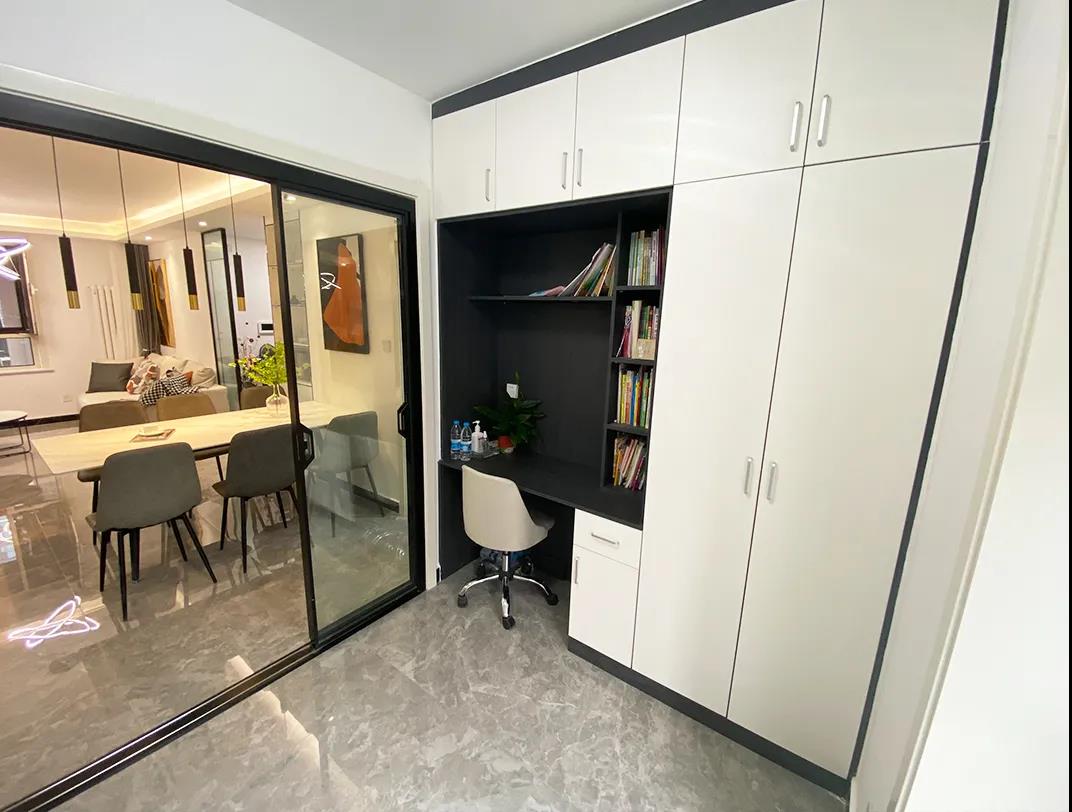 将原本次卧面积借给了客厅,打造了餐区。次卧被规划成了书房,推拉门的设计节省了空间,也给客厅增加了采光面。利用AG真人的定制家具,打造了一组多功能通顶储物柜,实现工作、储物两不误。双人位沙发床让整个空间还可以作临时客房来使用。