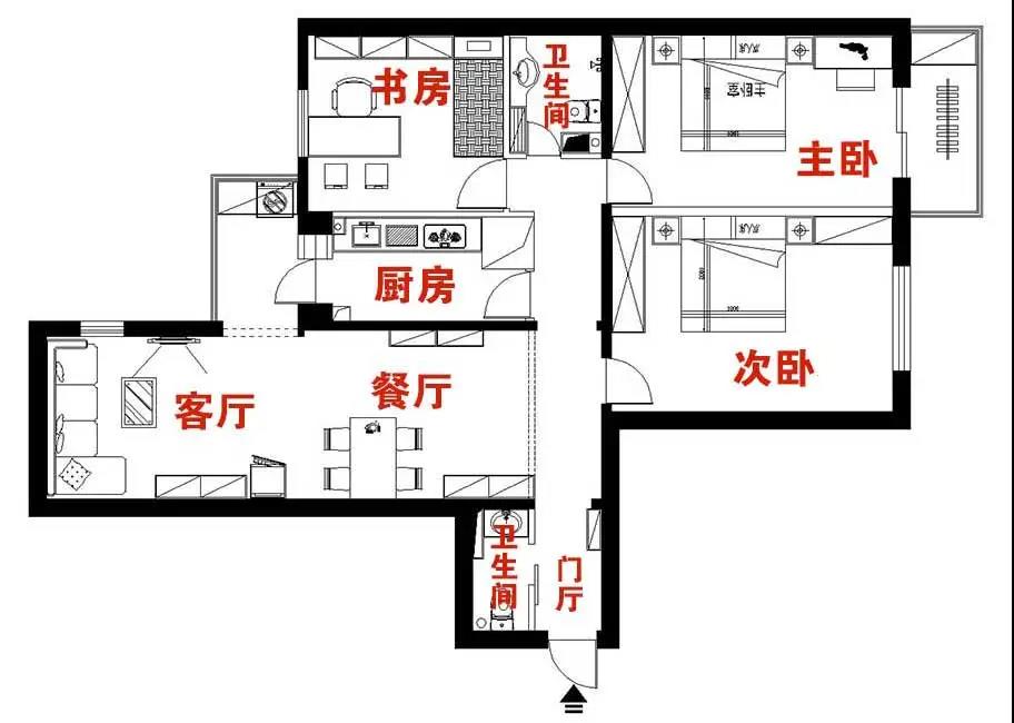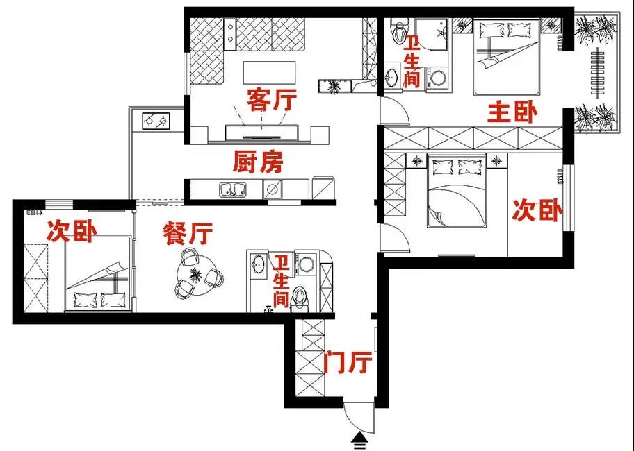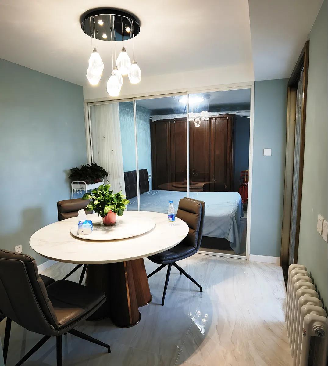 考虑到原有客厅门洞多、采光差,设计师给客厅又重新找了位置,而原来的这个客厅空间,则是规划成了次卧、餐区和卫生间,这三大功能。