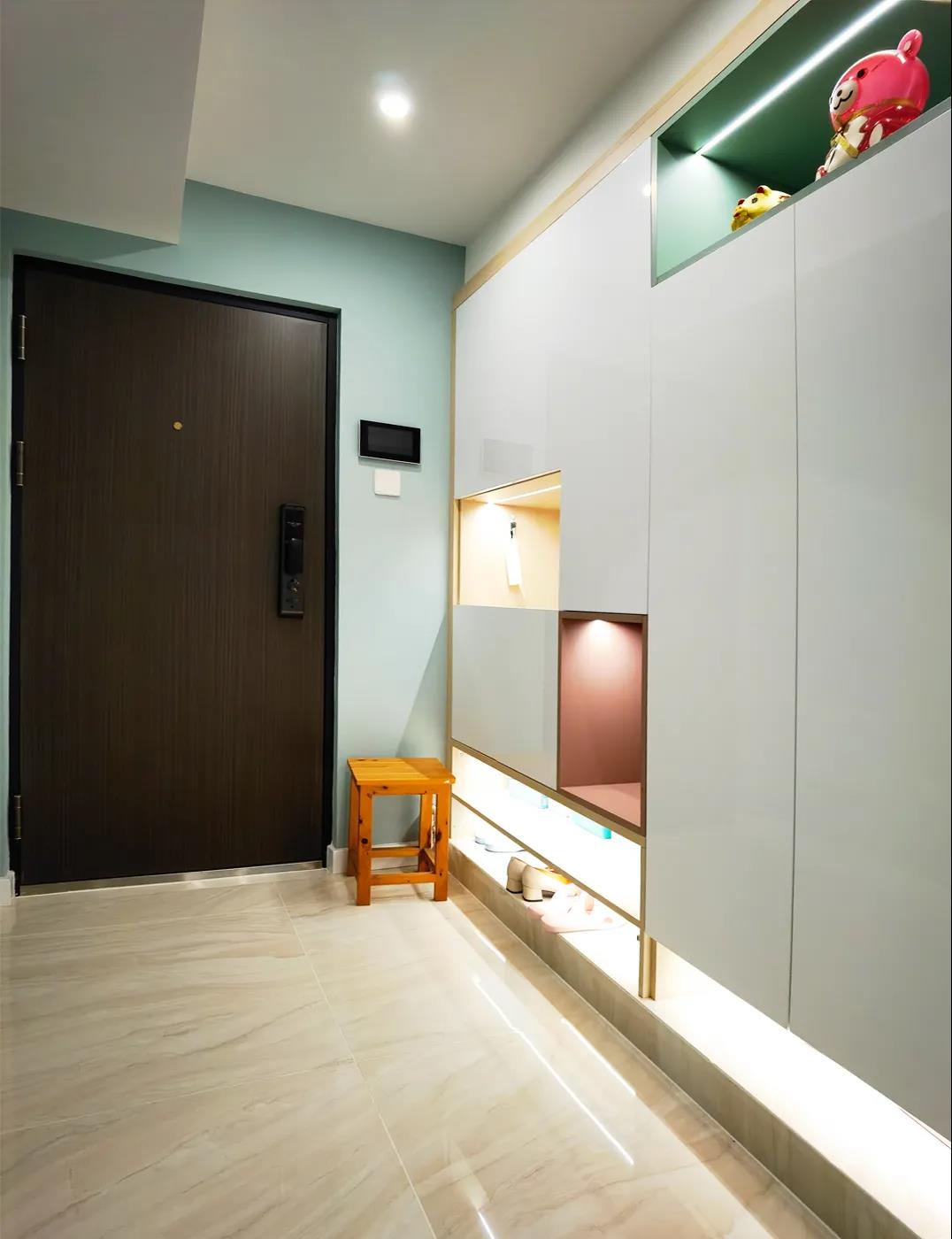 为了有效解决门厅昏暗、空间紧凑的问题,设计师借用进门左手边两平米的卫生间,将这部分空间纳入到门厅,利用这部分空间打造了一组定制的通顶鞋帽柜,配合整体灯光的设计,美观实用,储物强大。