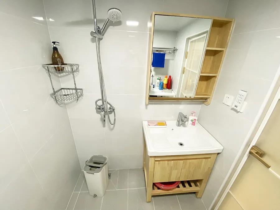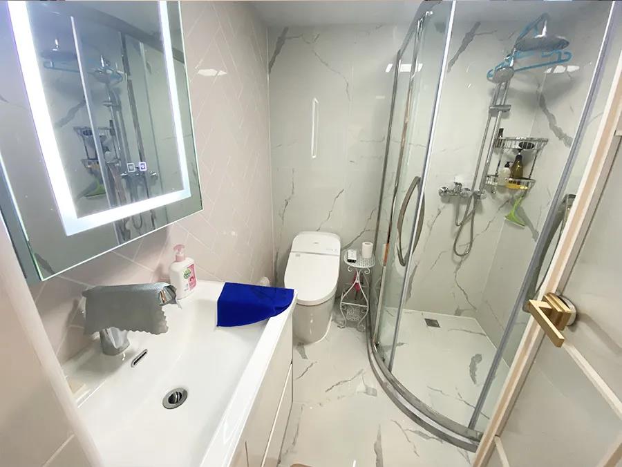 门厅占用了原有卫生间后,设计师在原来的客厅里,单独为一家人隔出了一个卫生间。这个卫生间将近4平米,淋浴、如厕、洗手盆、洗衣机全被安排进来,而且调整位置后的卫生间,离卧室区域更近,更方便使用。