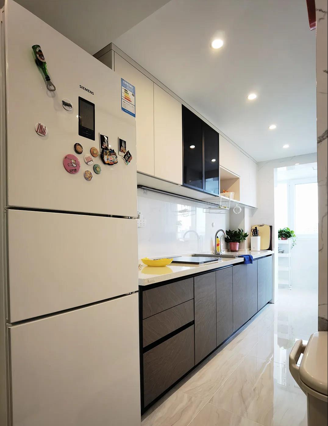设计师打破常规,压缩了厨房的面积,厨房里做了一组一字形的橱柜,冰箱移厨房,和橱柜进行了整体规划。