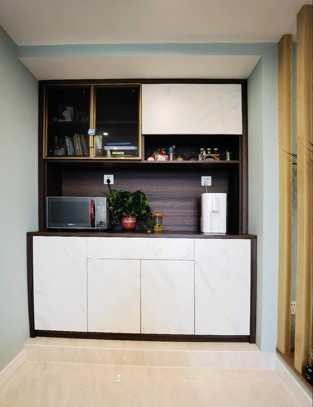 利用定制家具,打造了一组通顶储物柜,补充储物的同时,这里还能临时沏茶、煮咖啡,让生活更加舒适、便捷、有品质。