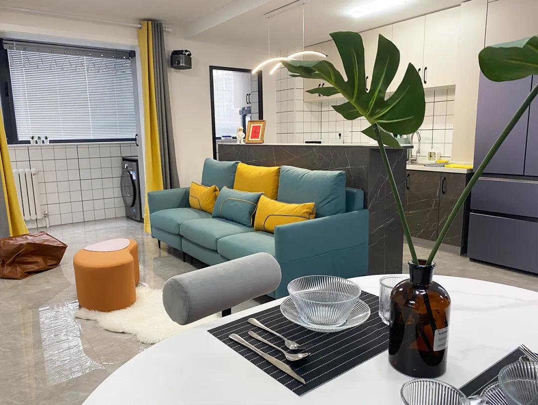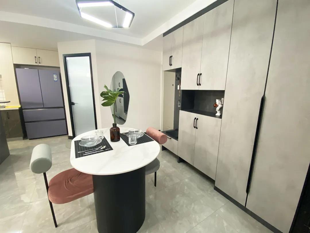 为了让餐区使用更合理、采光更好,设计师拆掉了原有次卧和餐区的隔断墙,餐区重新规划在了这里,并且为餐区规划了回游式动线,四周都可以通行,还可以灵活的增加座椅,盘活了整个空间,让整体空间显得更加开阔。
