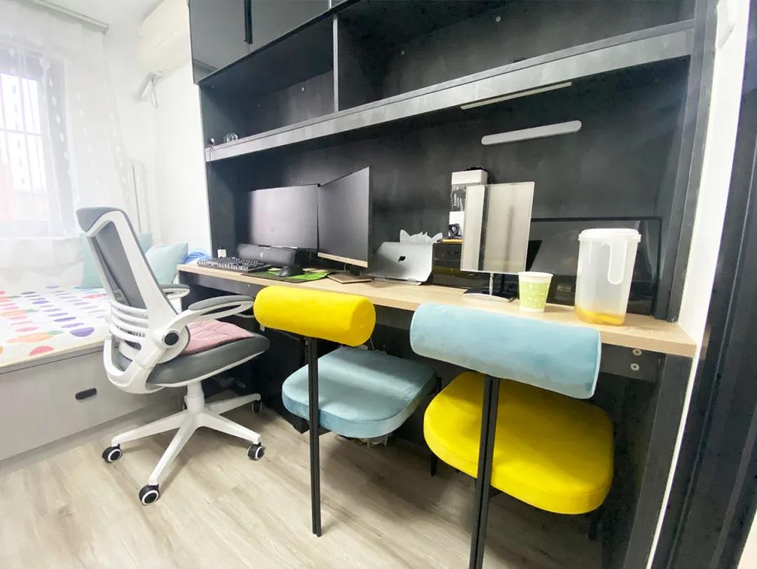 次卧室则是打造成了一个多变的空间,暂时可以作为工作区、化妆区、休闲娱乐区,未来有了孩子,还可以作为独立的儿童房,让这个空间有了更多的可变性。