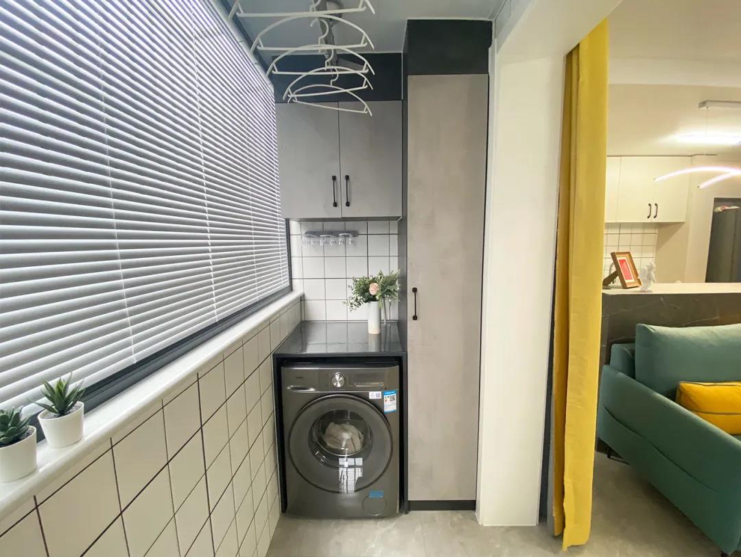 阳台空间与客厅空间进行联动,将原本挤在卫生间的洗衣机移到阳台,利用定制家具打造了洗衣房,洗衣、晾晒更加方便。